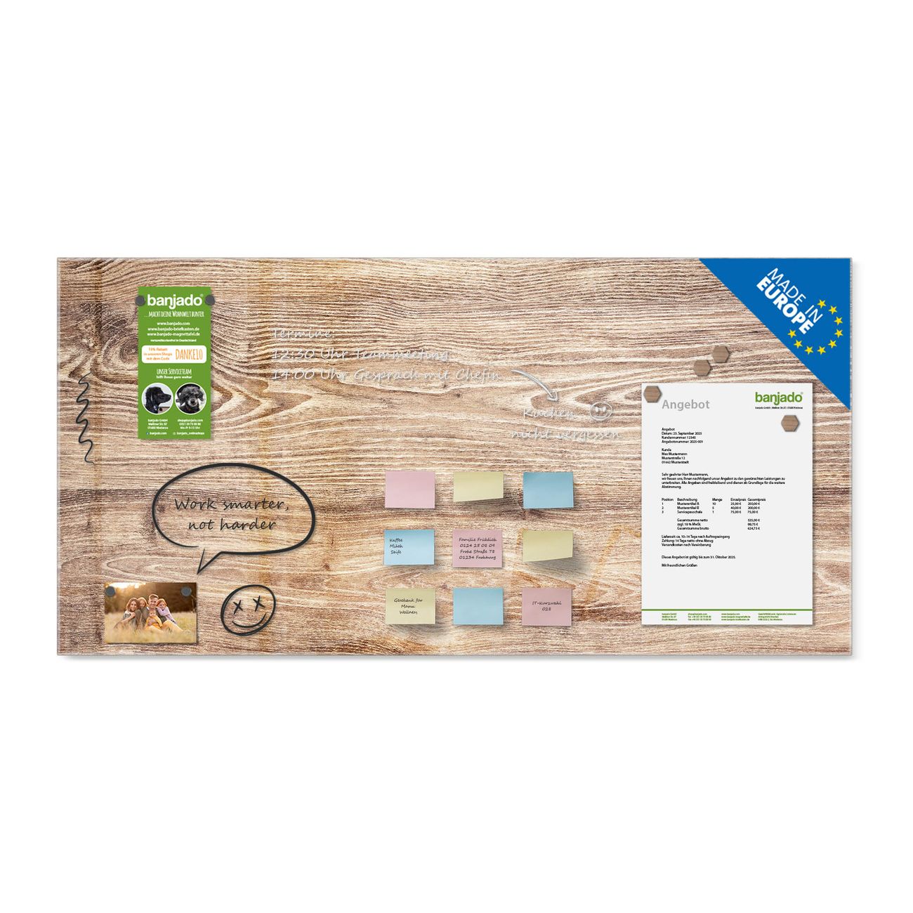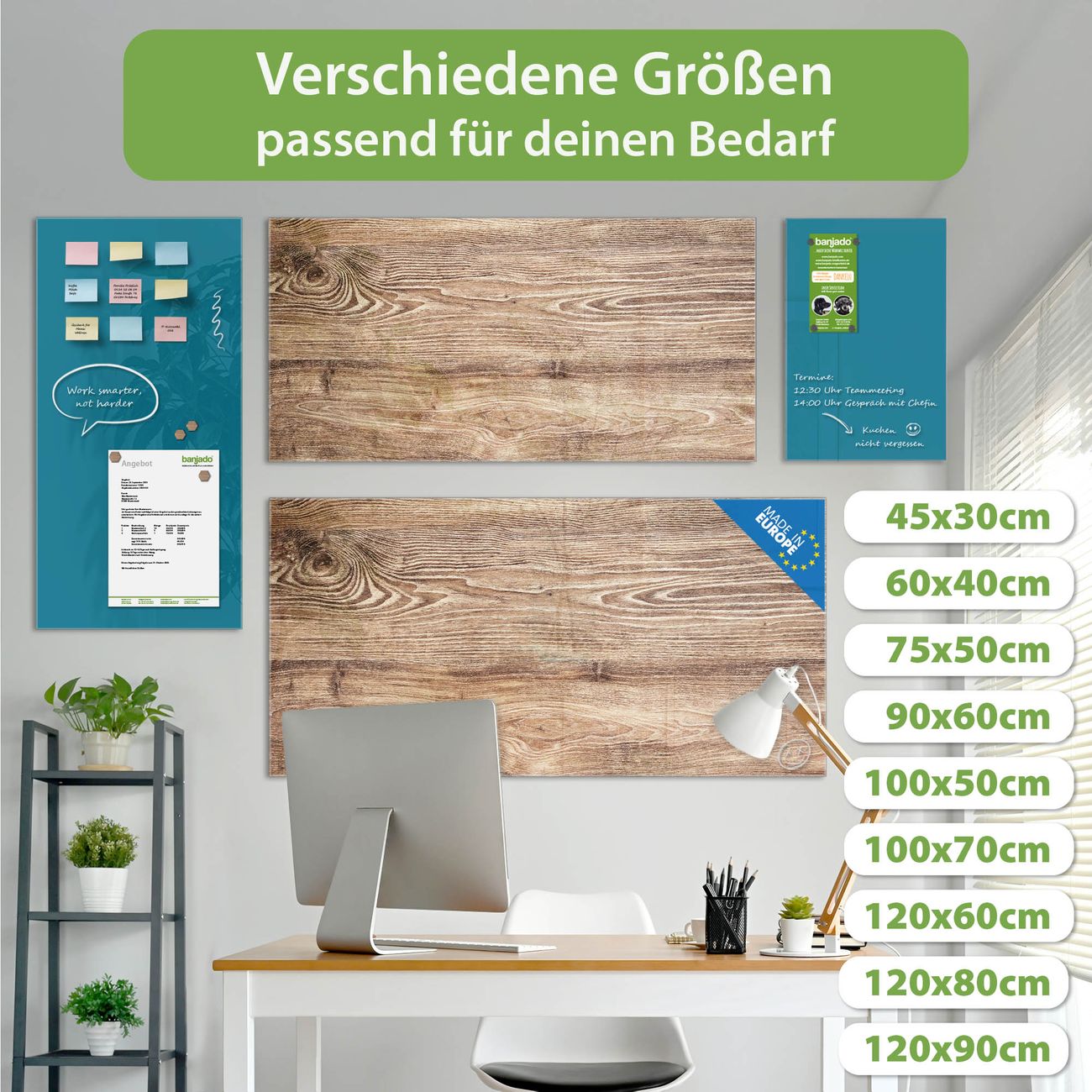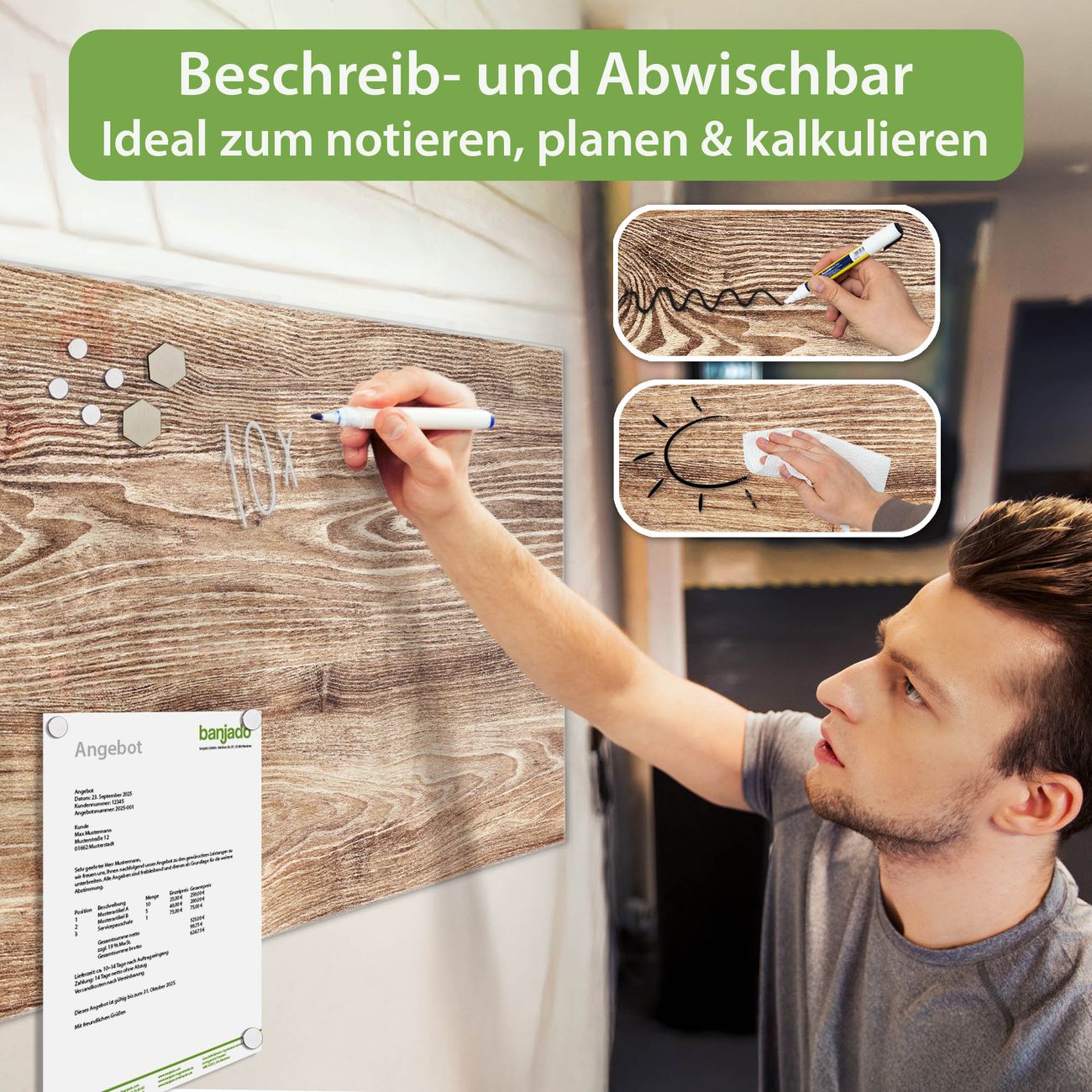 Material: 4mm Sicherheitsglas mit Metallrückwand Eigenschaften: beschreibbar, magnetisch, kratzfest Maße: 100x50x0,6cm, 7,50kg schwer Motiv Nummer 12192 Maserung Zubehör: inklusive 4 Neodym-Magnete