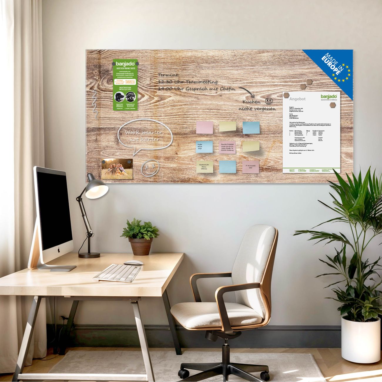 Die banjado Glas Magnettafel mit dem Motiv Motiv Maserung verbindet Funktionalität mit Stil. Sie ersetzt das Zettelchaos durch klare Strukturen und bringt dabei eine warme, natürliche Atmosphäre in Ihr Zuhause. Ob im Büro, in der Küche oder im Eingangsbereich - dieses Design-Board zieht Blicke an und sorgt für Ordnung mit Charakter.