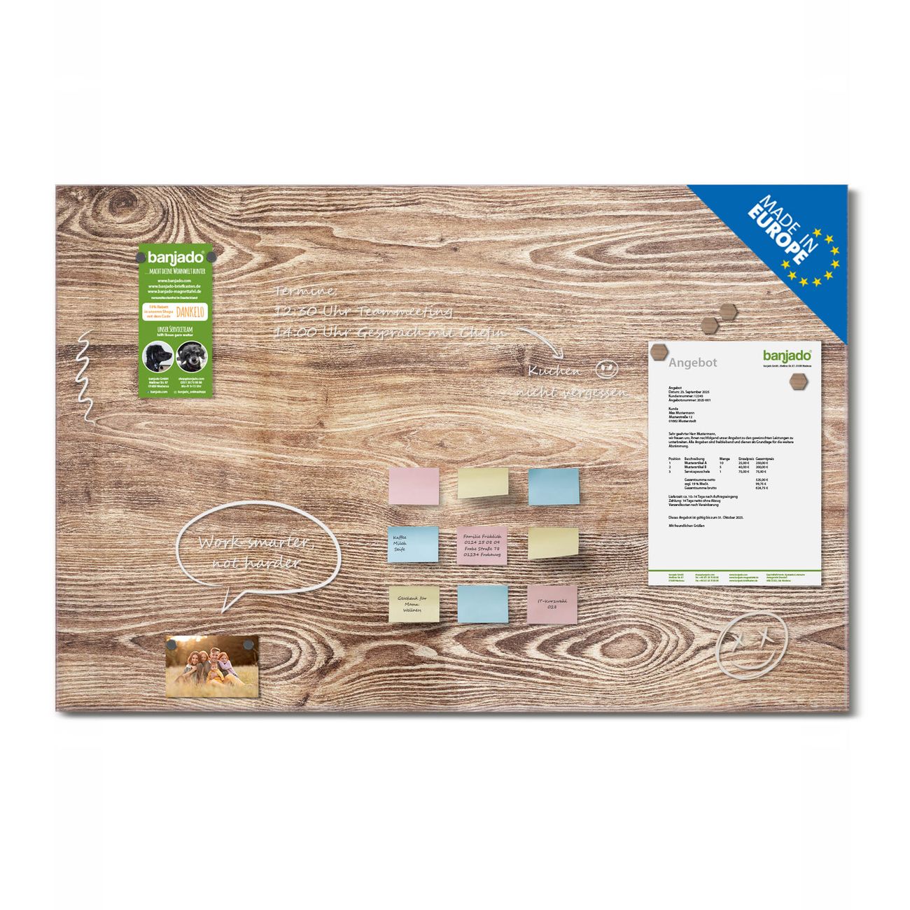 Jede Glas Magnettafel wird in unserer Werkstatt von Hand gefertigt und sorgfältig geprüft. So erhalten Sie ein echtes Qualitätsprodukt, das Funktion und Ästhetik perfekt vereint.?? Warum banjado?