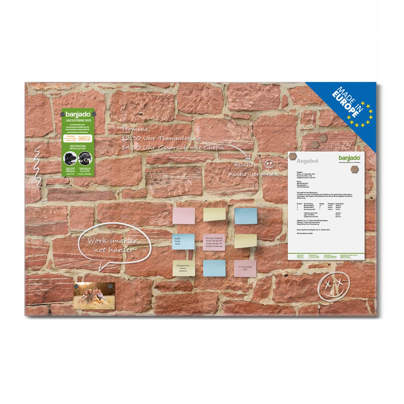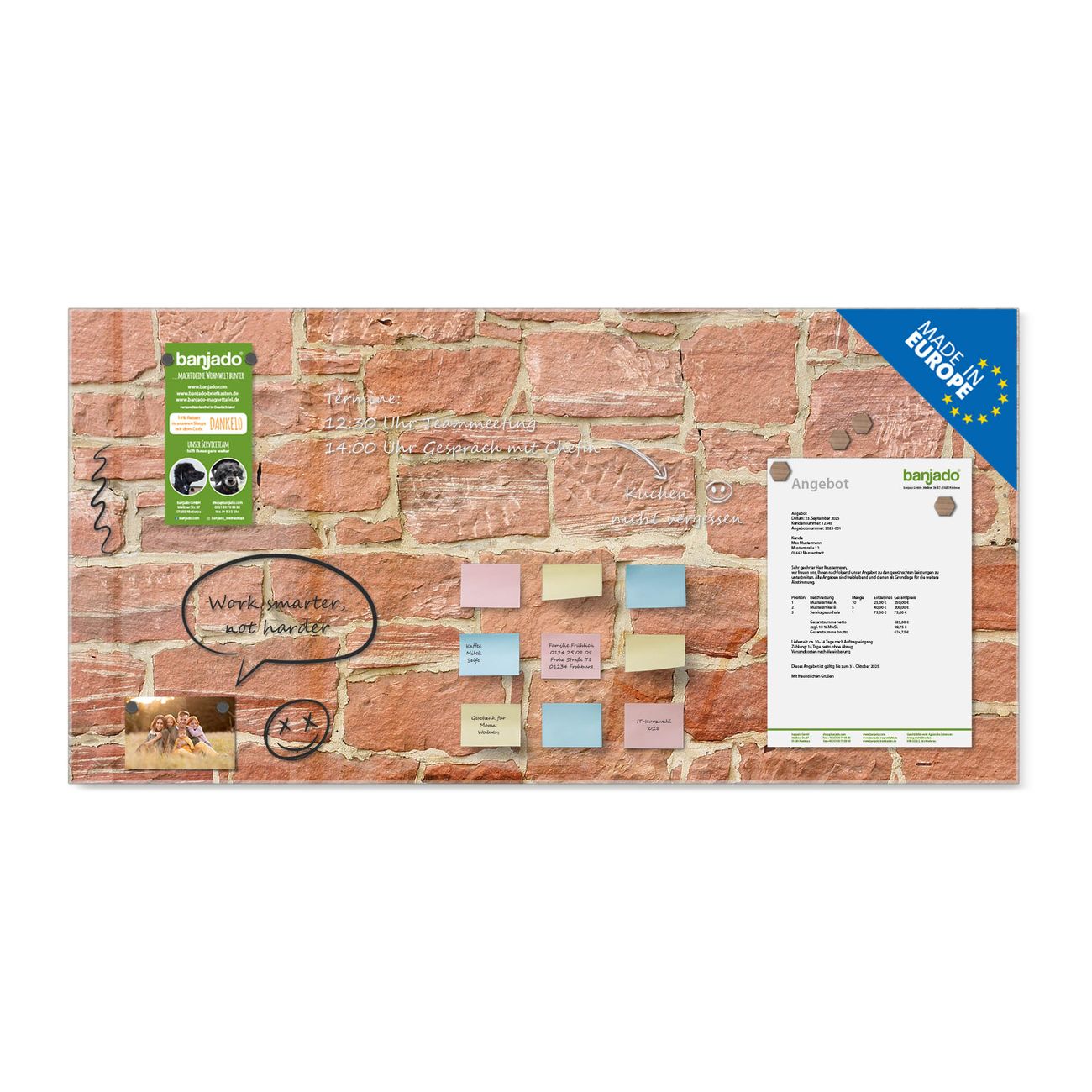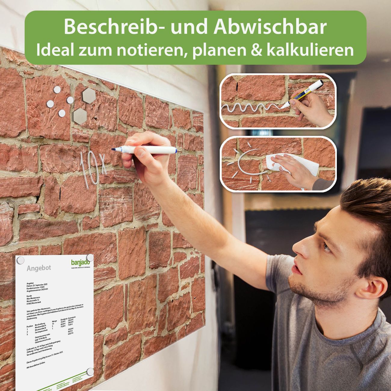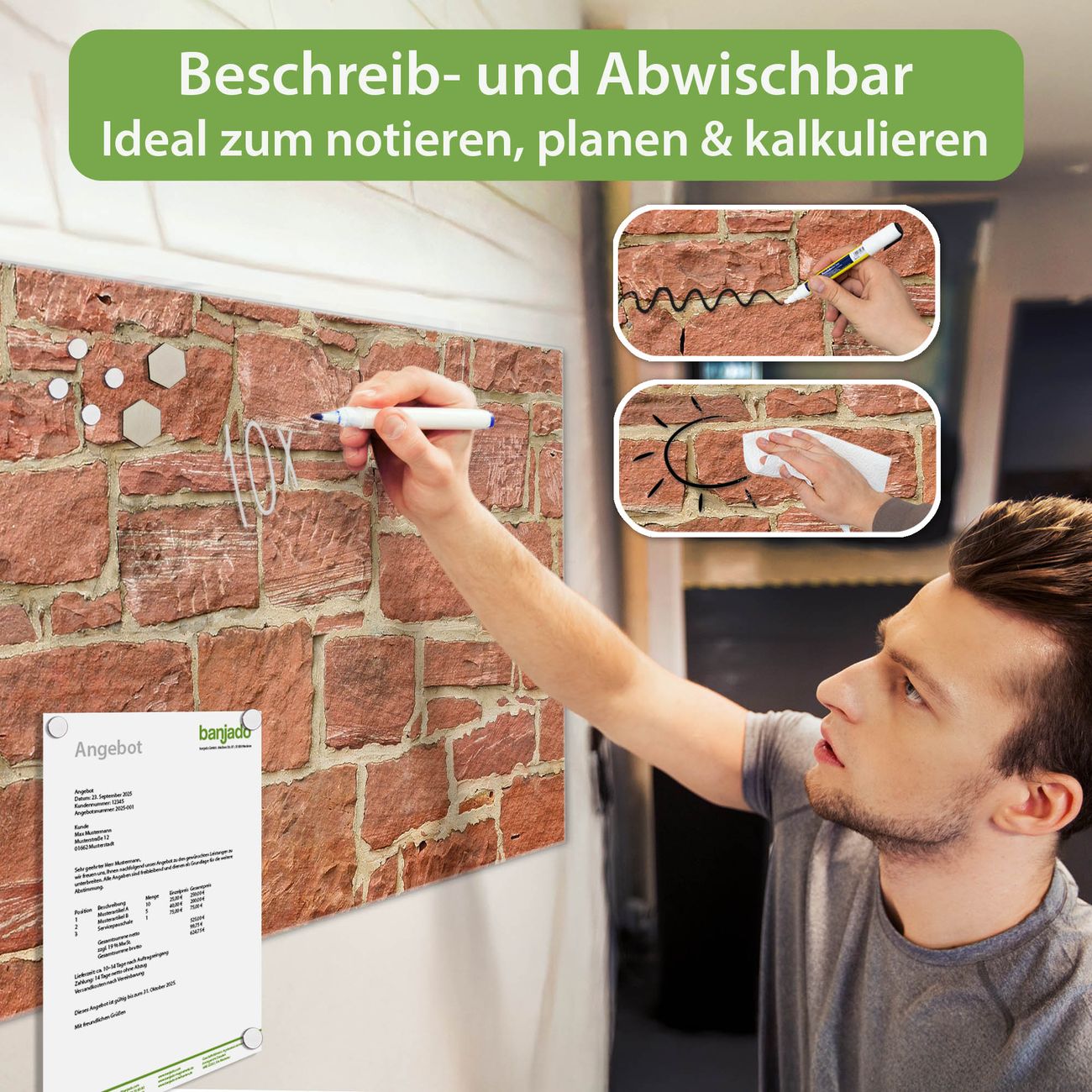 Material: 4mm Sicherheitsglas mit Metallrückwand Eigenschaften: beschreibbar, magnetisch, kratzfest Maße: 120x60x0,6cm, 10,80kg schwer Motiv Nummer 10448 Mauerwerk Zubehör: inklusive 4 Neodym-Magnete