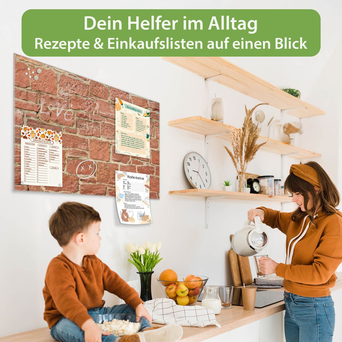 Auf der glatten Glasoberfläche lassen sich Termine, Rezepte oder Notizen ganz einfach mit Kreidestiften festhalten und rückstandslos entfernen. Starke Neodym-Magnete halten Ihre wichtigsten Erinnerungen sicher an Ort und Stelle. So entsteht Ihre ganz persönliche Ideenwand - jeden Tag neu.