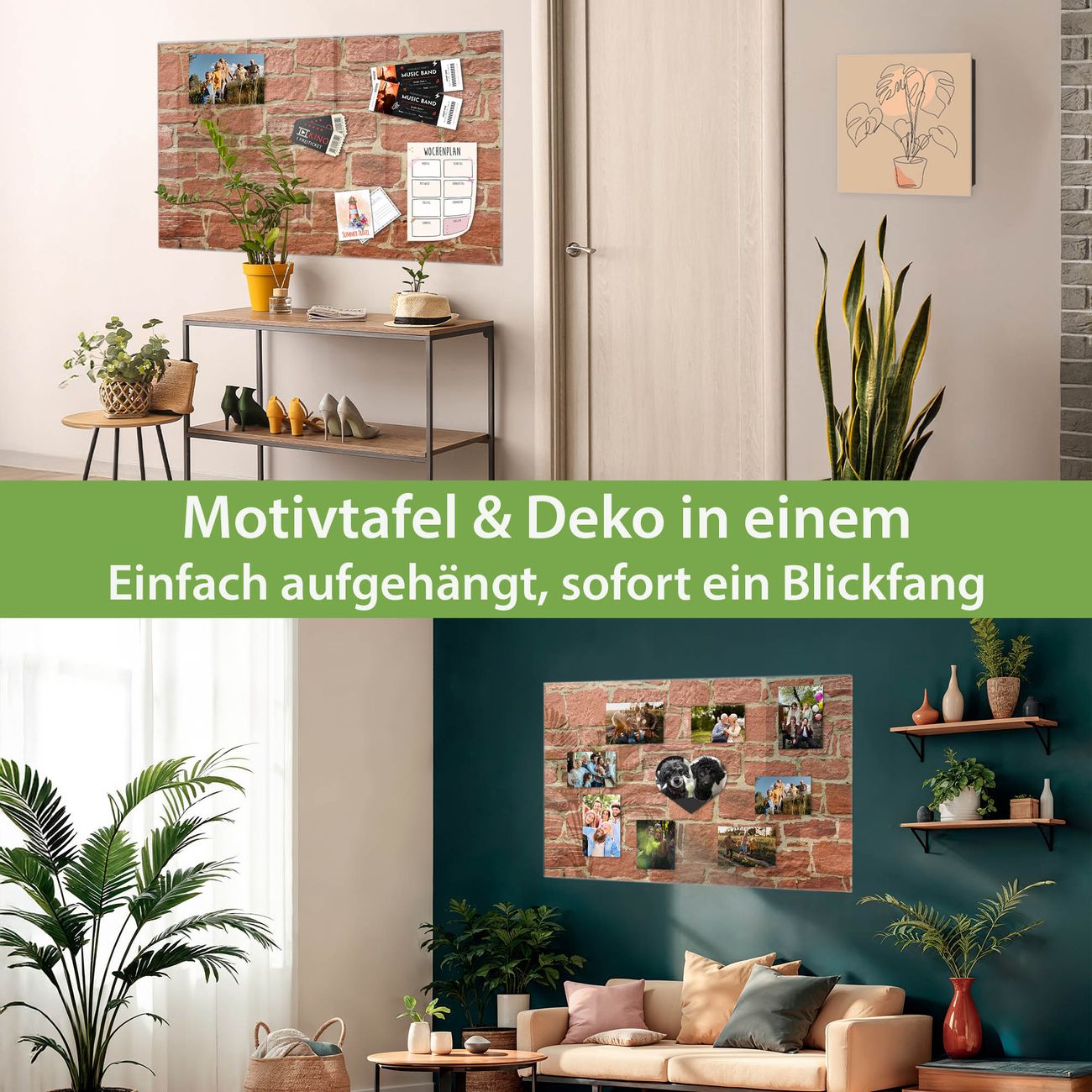 Material: 4mm Sicherheitsglas mit Metallrückwand Eigenschaften: beschreibbar, magnetisch, kratzfest Maße: 45x30x0,6cm, 2,03kg schwer Motiv Nummer 10448 Mauerwerk Zubehör: inklusive 4 Neodym-Magnete
