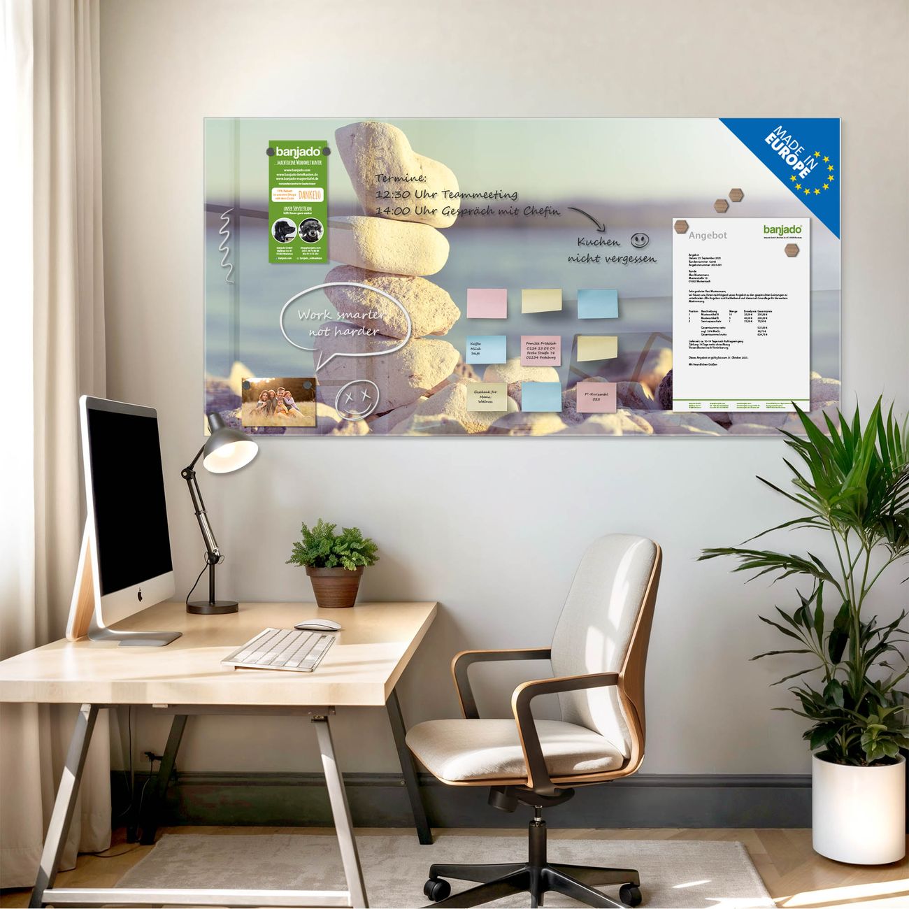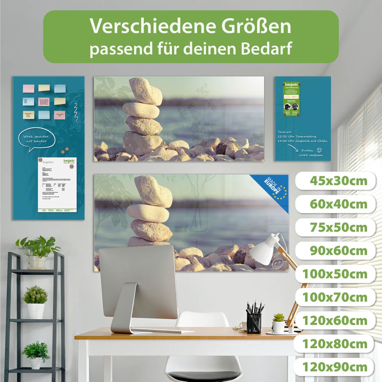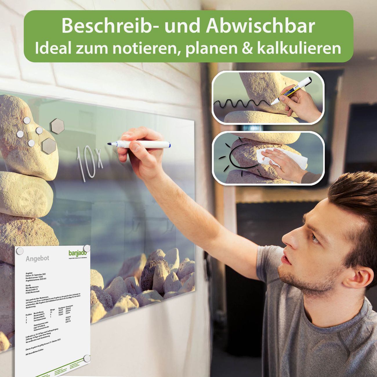 Material: 4mm Sicherheitsglas mit Metallrückwand Eigenschaften: beschreibbar, magnetisch, kratzfest Maße: 100x50x0,6cm, 7,50kg schwer Motiv Nummer 12317 Leichte Steine Zubehör: inklusive 4 Neodym-Magnete