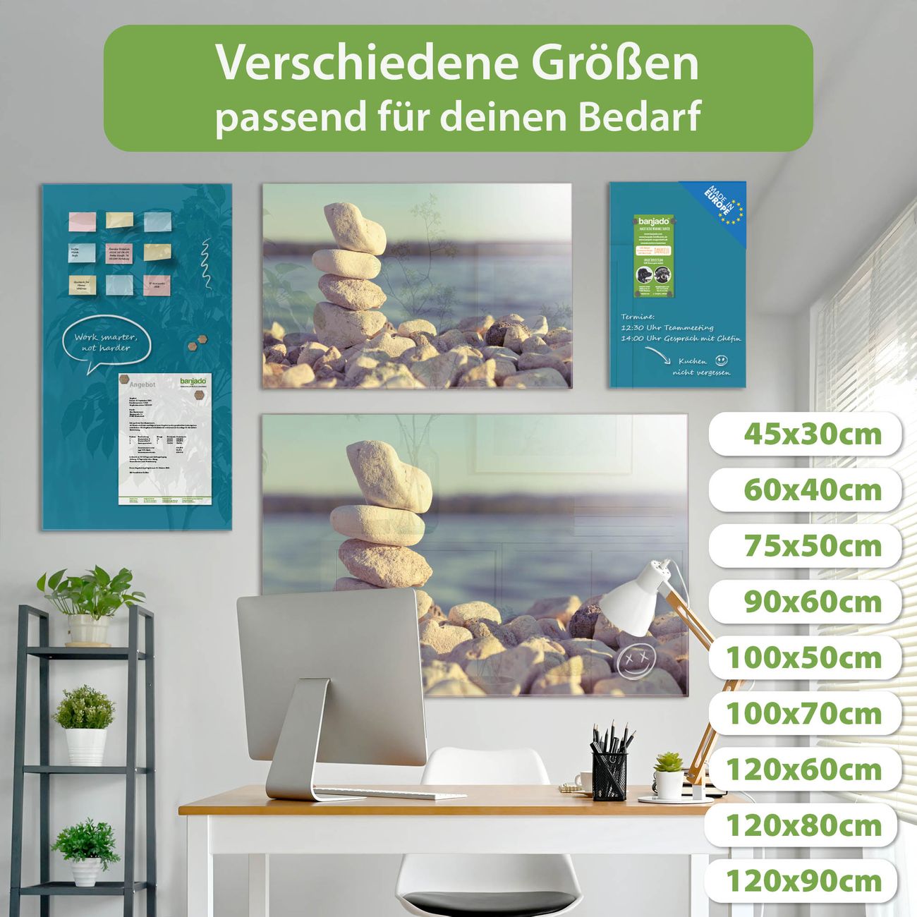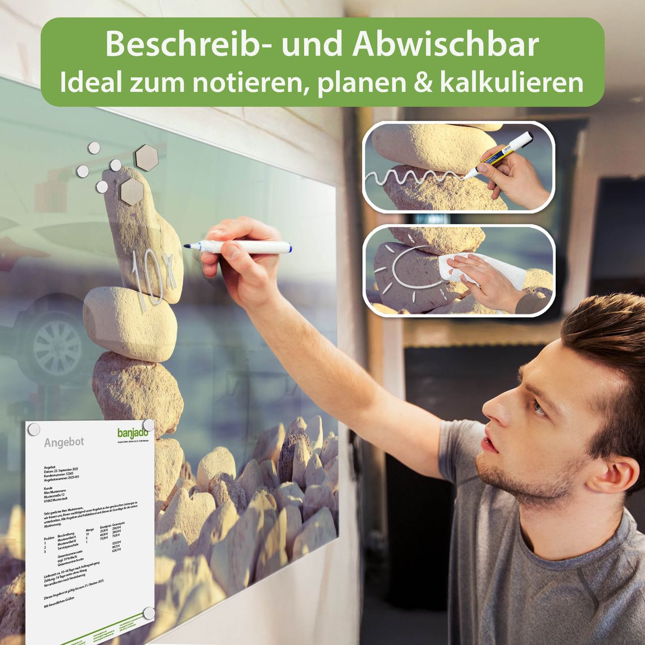 Material: 4mm Sicherheitsglas mit Metallrückwand Eigenschaften: beschreibbar, magnetisch, kratzfest Maße: 120x80x0,6cm, 14,40kg schwer Motiv Nummer 12317 Leichte Steine Zubehör: inklusive 4 Neodym-Magnete