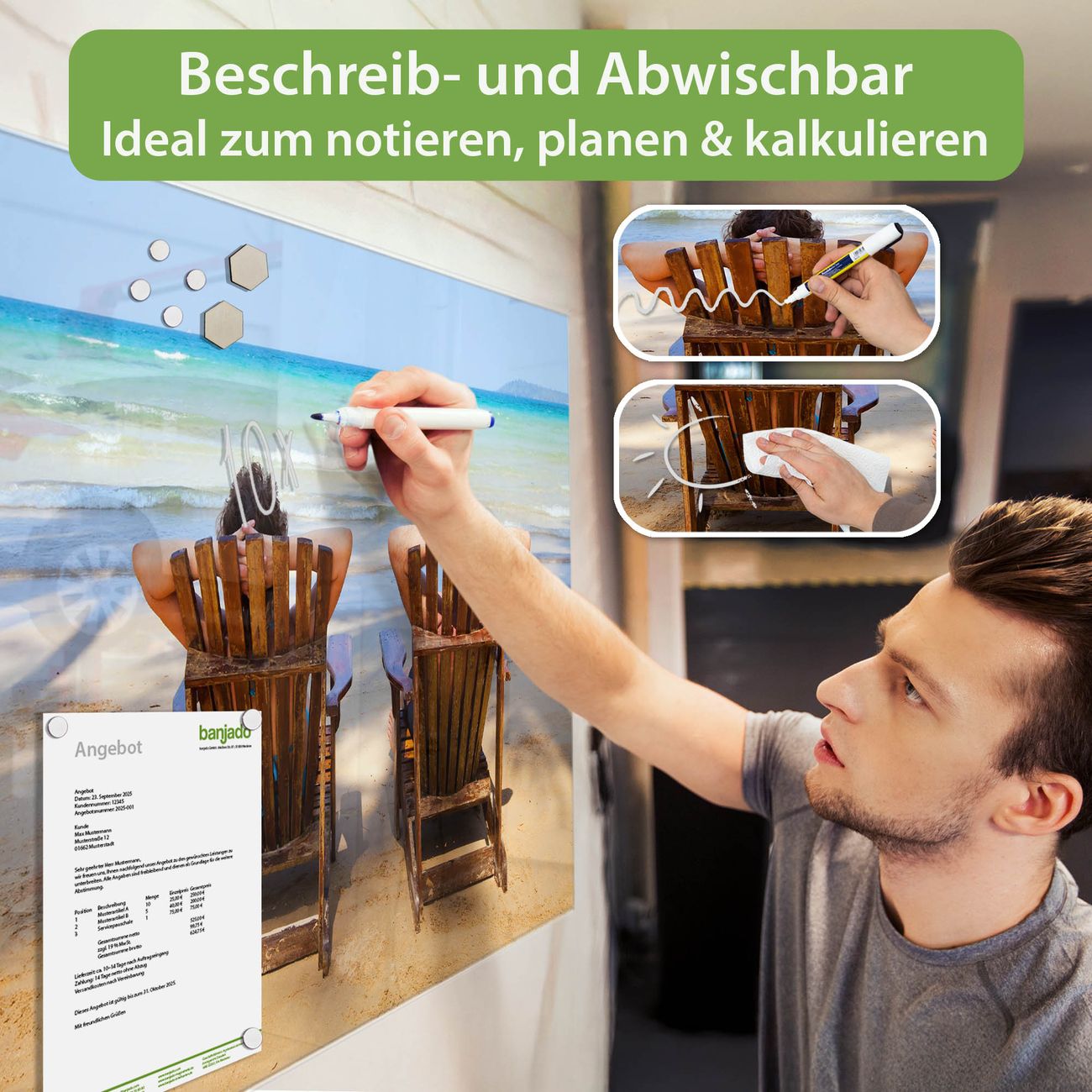 Bitte beachten Sie, dass ausschliessliche spezielle Magnete an der Glastafel haften. Wir empfehlen banjado Neodym Magnete, diese sind durch uns auf Wirksamkeit geprüft.