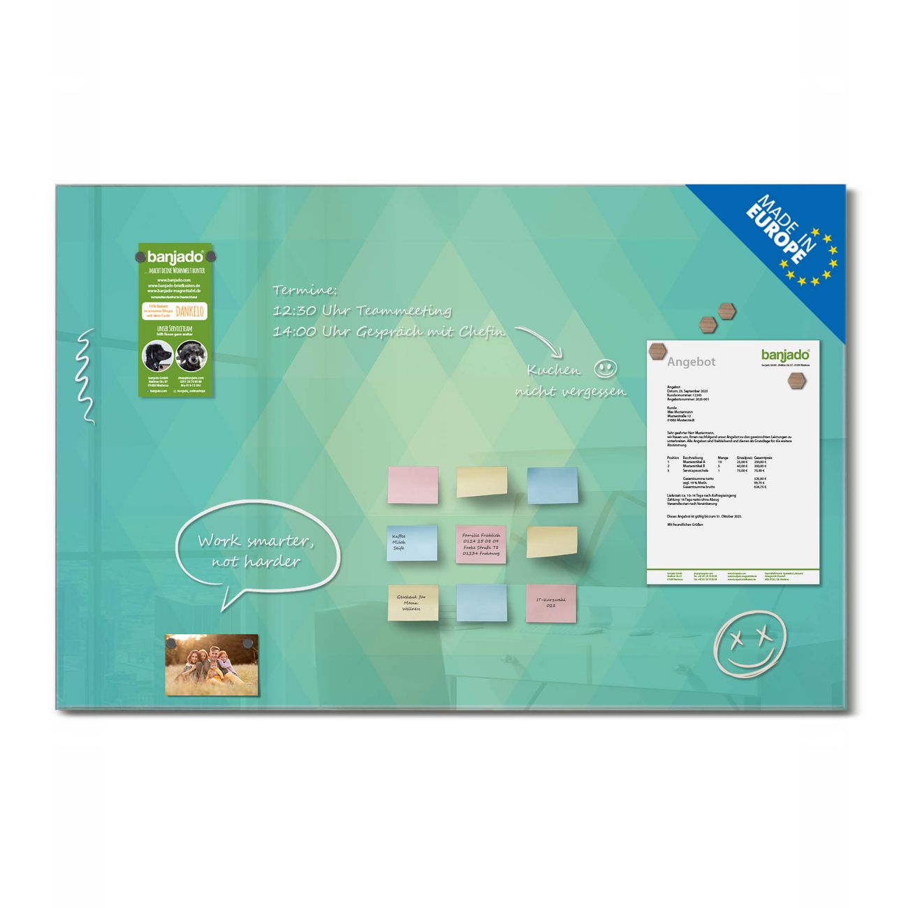 Material: 4mm Sicherheitsglas mit Metallrückwand Eigenschaften: beschreibbar, magnetisch, kratzfest Maße: 120x80x0,6cm, 14,40kg schwer Motiv Nummer 12559 Meeresblau Zubehör: inklusive 4 Neodym-Magnete