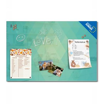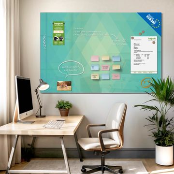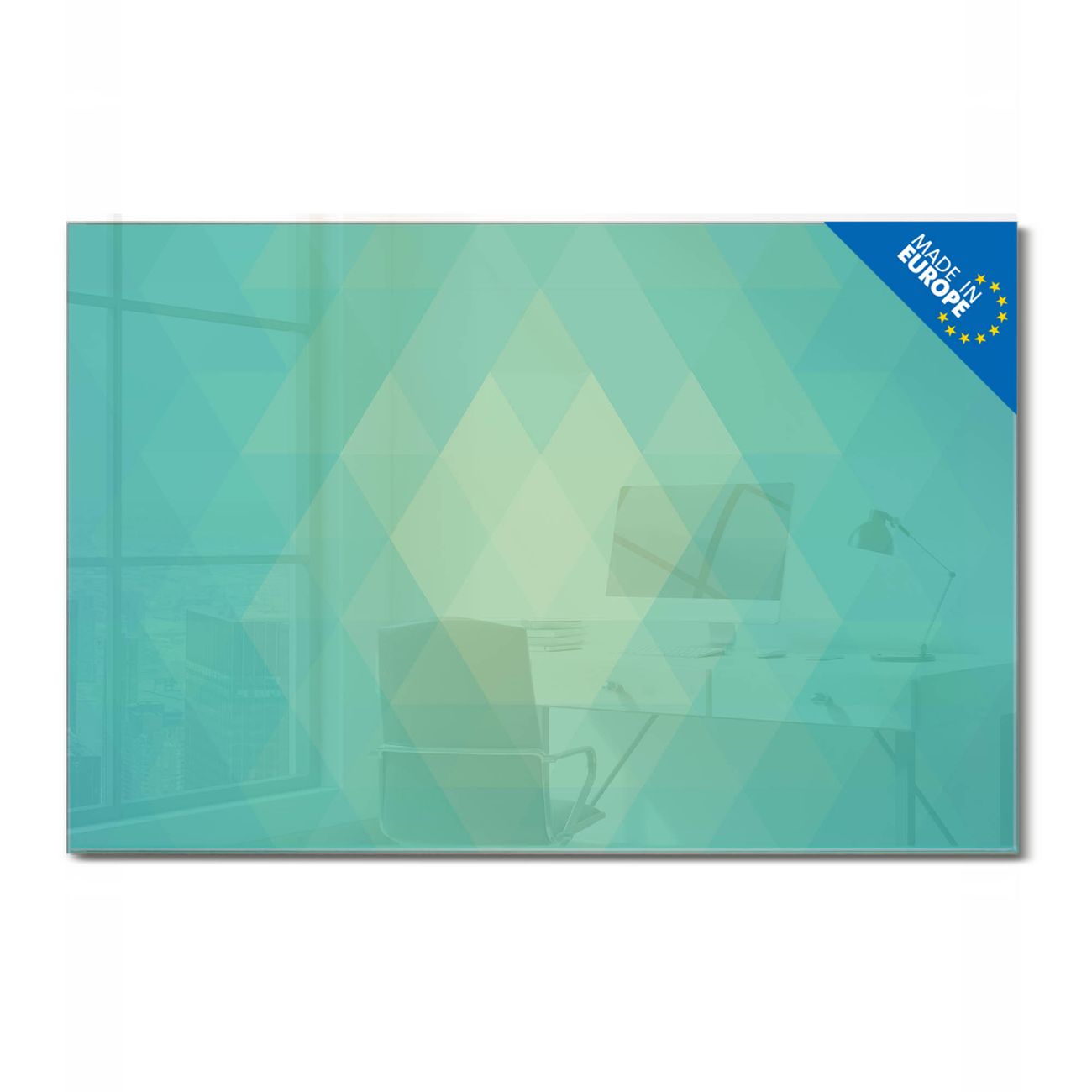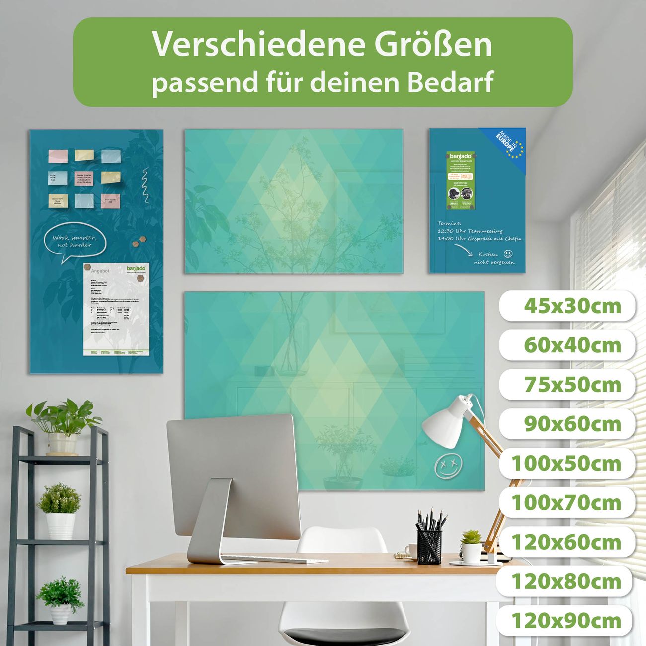 Material: 4mm Sicherheitsglas mit Metallrückwand Eigenschaften: beschreibbar, magnetisch, kratzfest Maße: 75x50x0,6cm, 5,63kg schwer Motiv Nummer 12559 Meeresblau Zubehör: inklusive 4 Neodym-Magnete