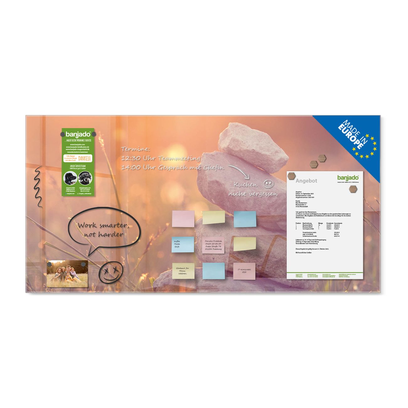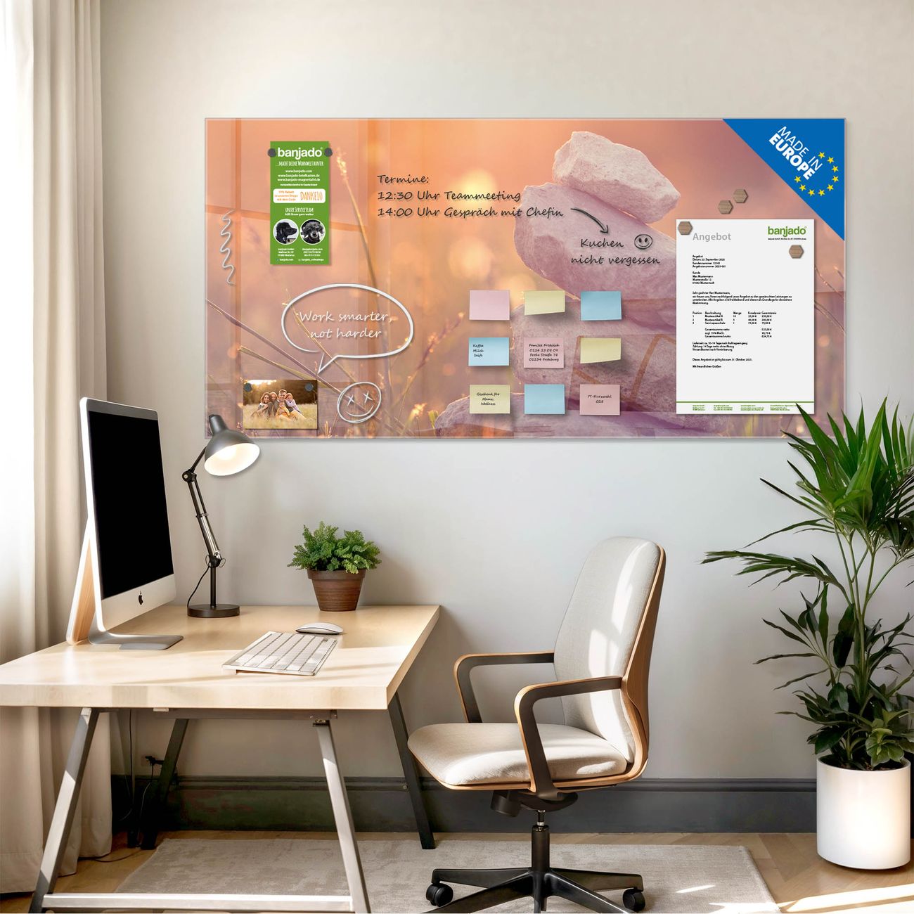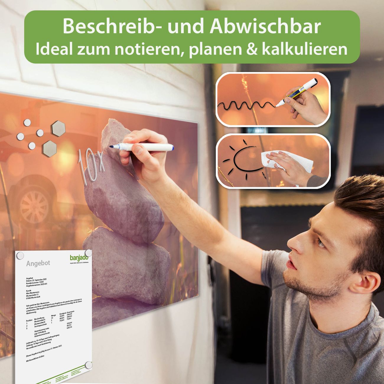 Jede Glas Magnettafel wird in unserer Werkstatt von Hand gefertigt und sorgfältig geprüft. So erhalten Sie ein echtes Qualitätsprodukt, das Funktion und Ästhetik perfekt vereint.?? Warum banjado?