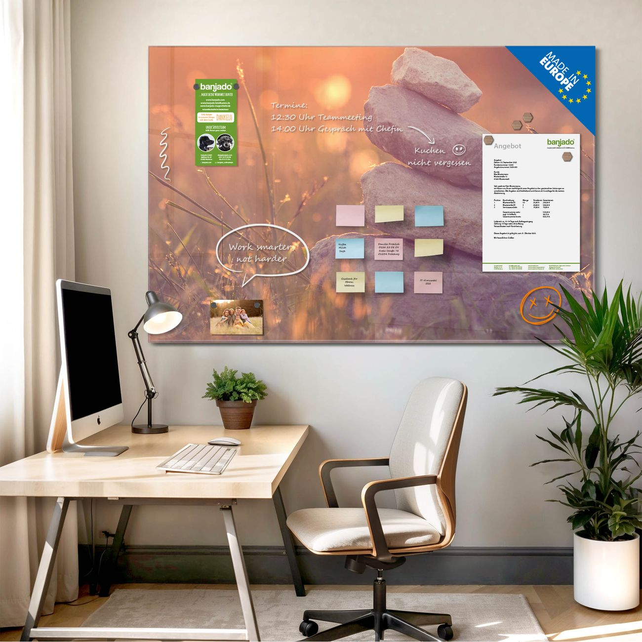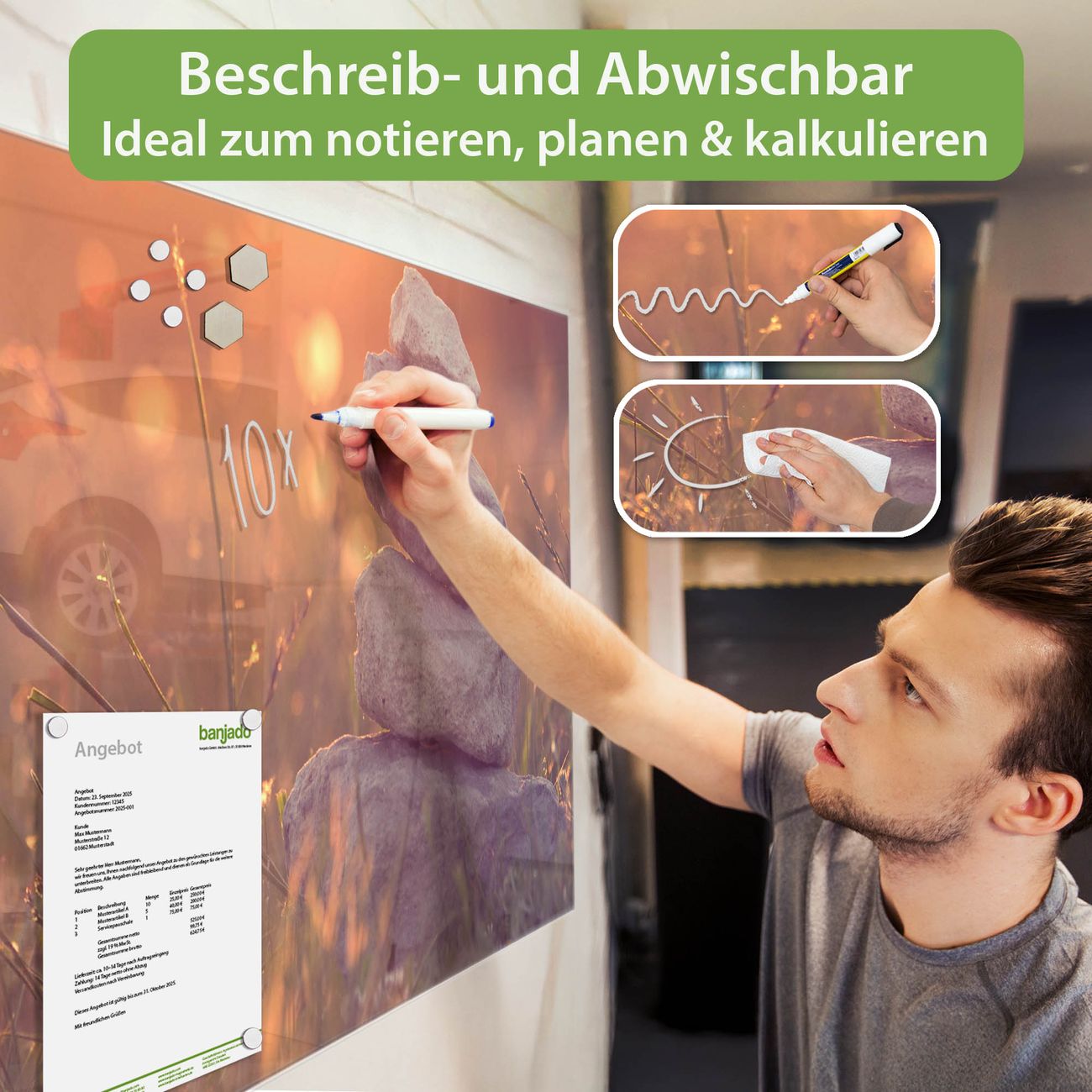 Jede Glas Magnettafel wird in unserer Werkstatt von Hand gefertigt und sorgfältig geprüft. So erhalten Sie ein echtes Qualitätsprodukt, das Funktion und Ästhetik perfekt vereint.?? Warum banjado?