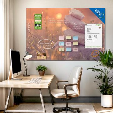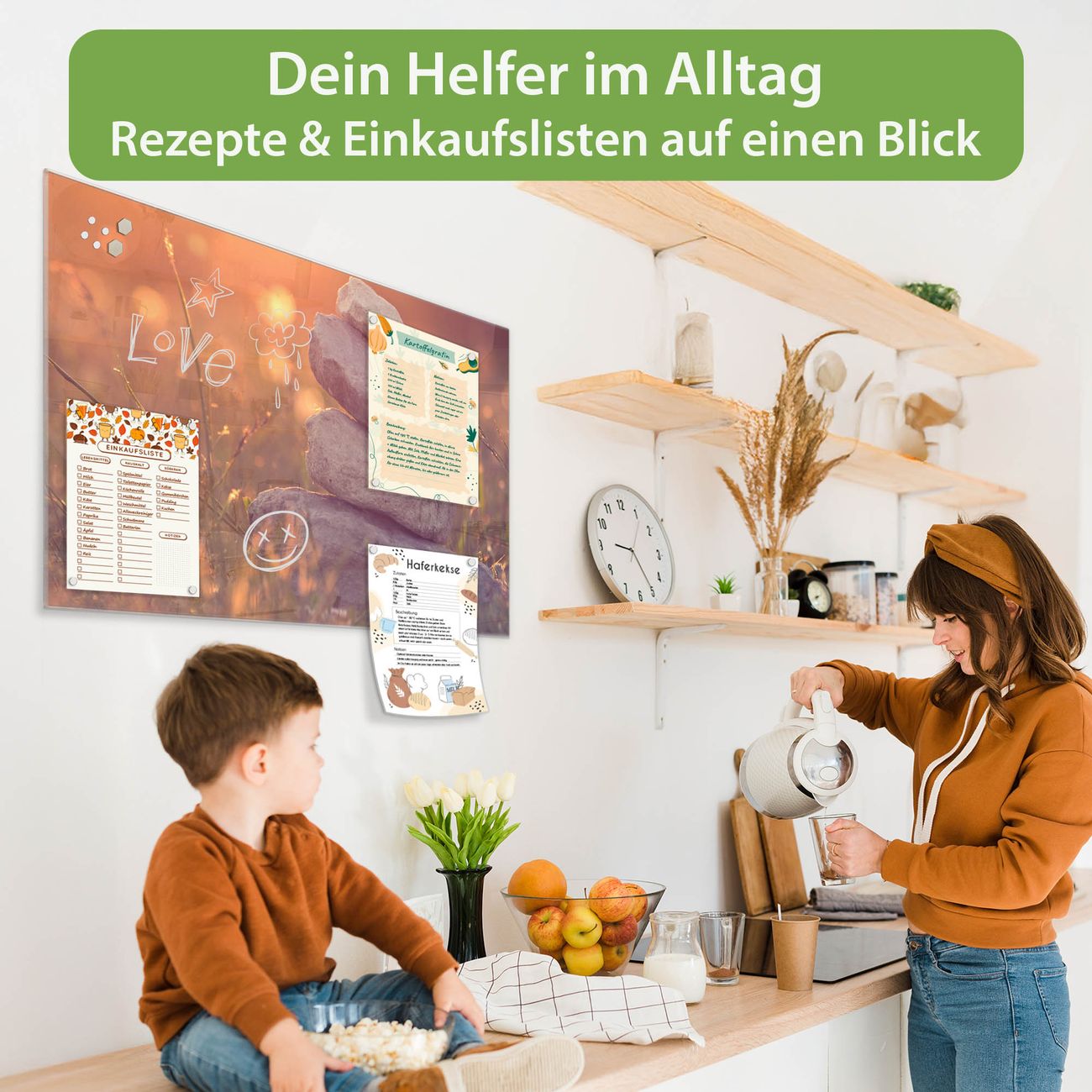 Auf der glatten Glasoberfläche lassen sich Termine, Rezepte oder Notizen ganz einfach mit Kreidestiften festhalten und rückstandslos entfernen. Starke Neodym-Magnete halten Ihre wichtigsten Erinnerungen sicher an Ort und Stelle. So entsteht Ihre ganz persönliche Ideenwand - jeden Tag neu.