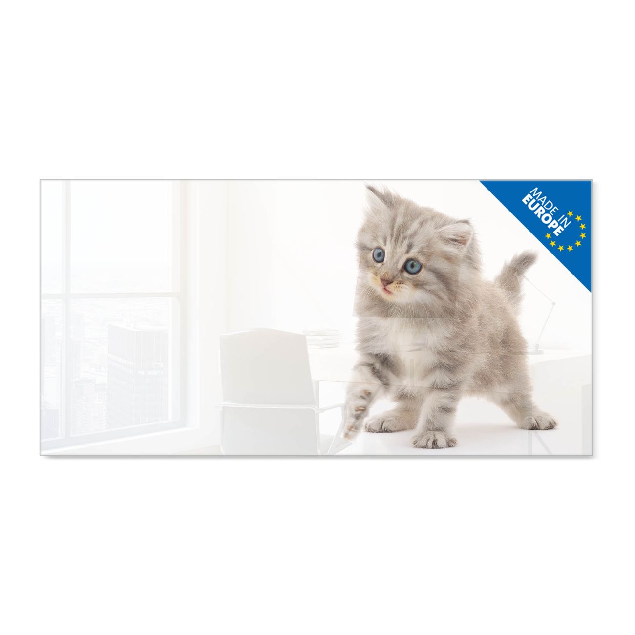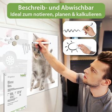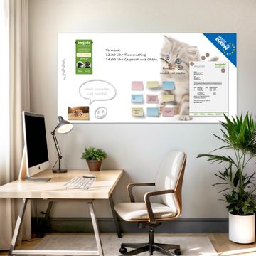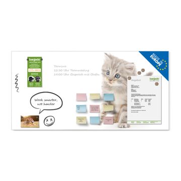 Material: 4mm Sicherheitsglas mit Metallrückwand Eigenschaften: beschreibbar, magnetisch, kratzfest Maße: 100x50x0,6cm, 7,50kg schwer Motiv Nummer 10223 Miau Zubehör: inklusive 4 Neodym-Magnete