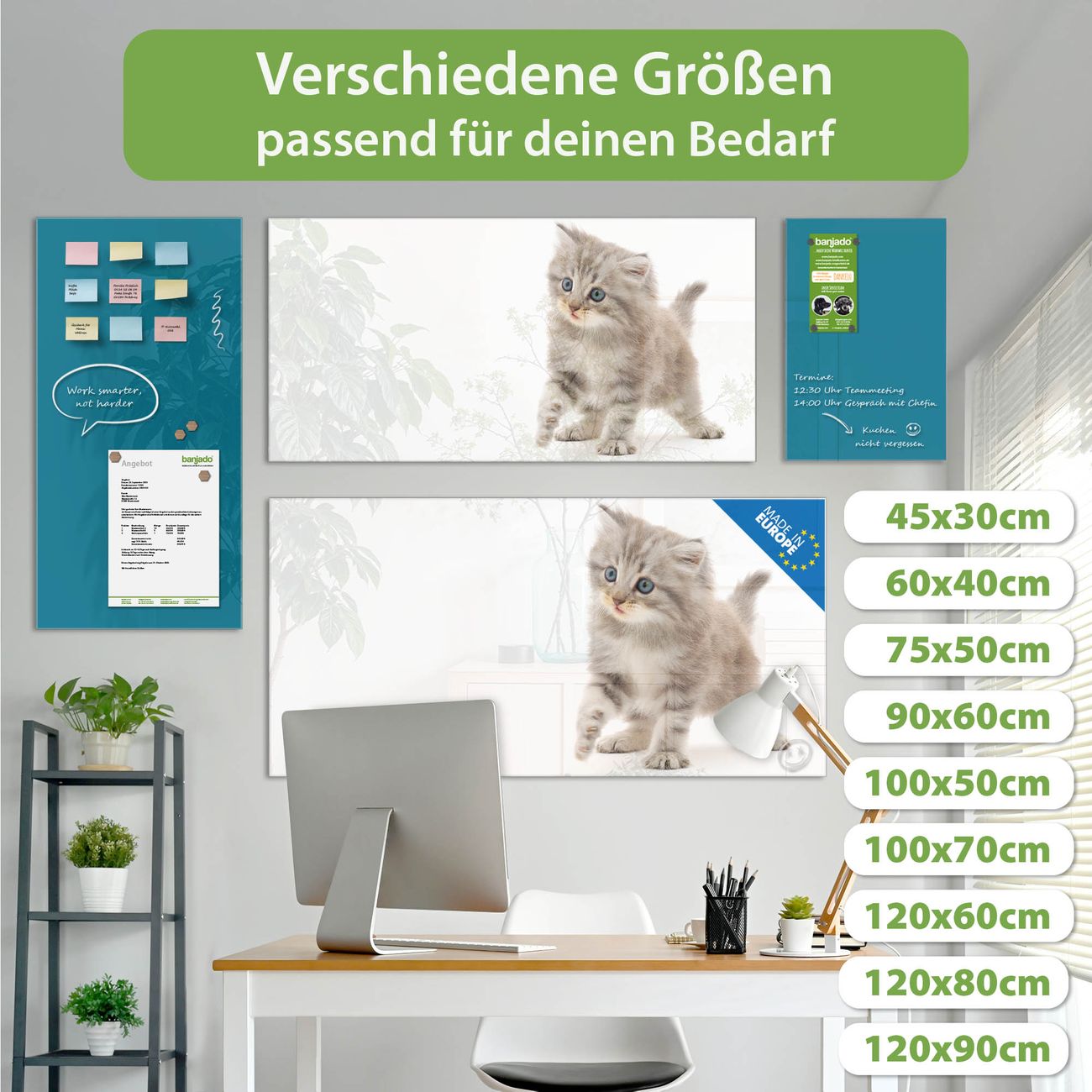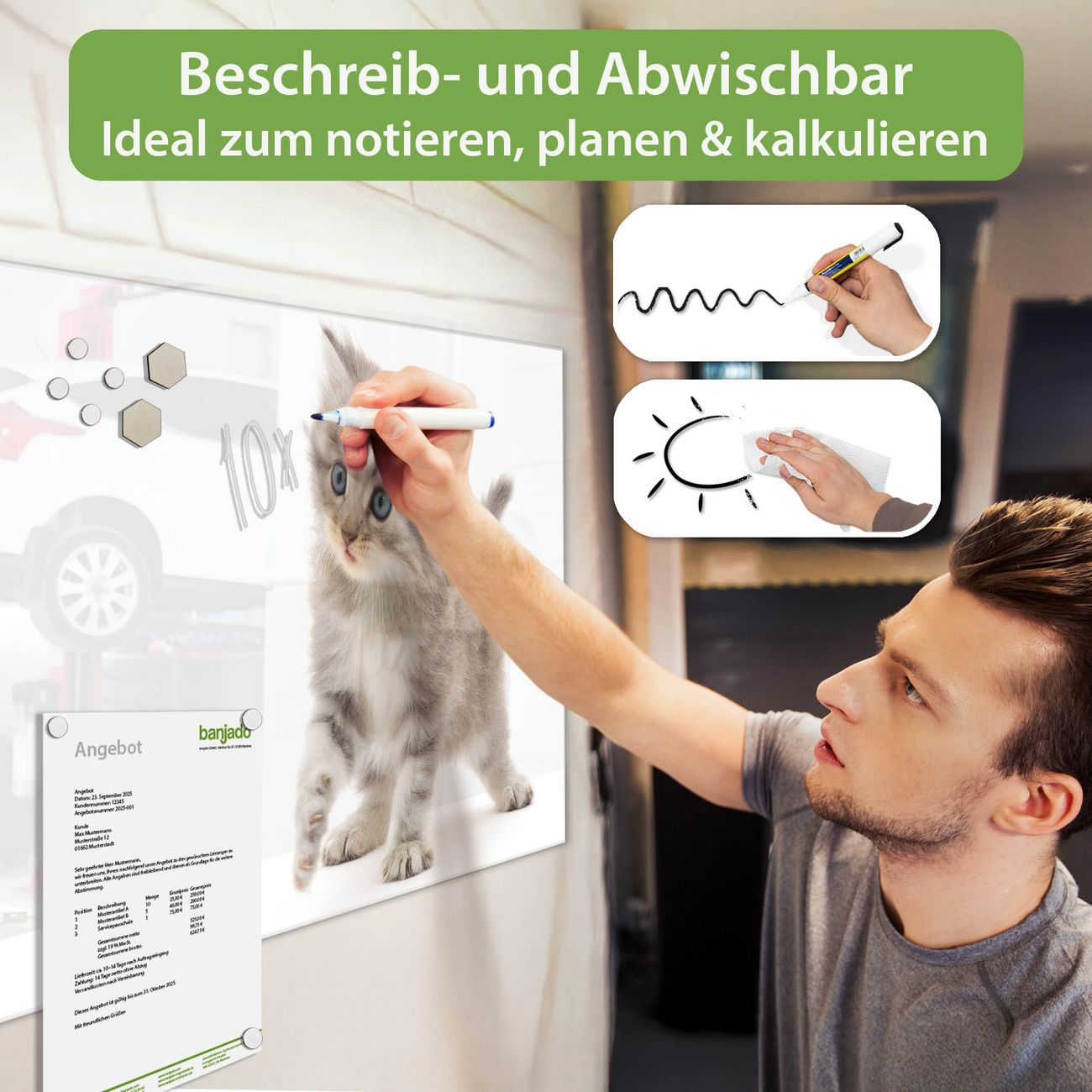 Jede Glas Magnettafel wird in unserer Werkstatt von Hand gefertigt und sorgfältig geprüft. So erhalten Sie ein echtes Qualitätsprodukt, das Funktion und Ästhetik perfekt vereint.?? Warum banjado?