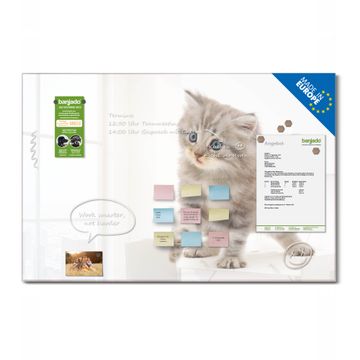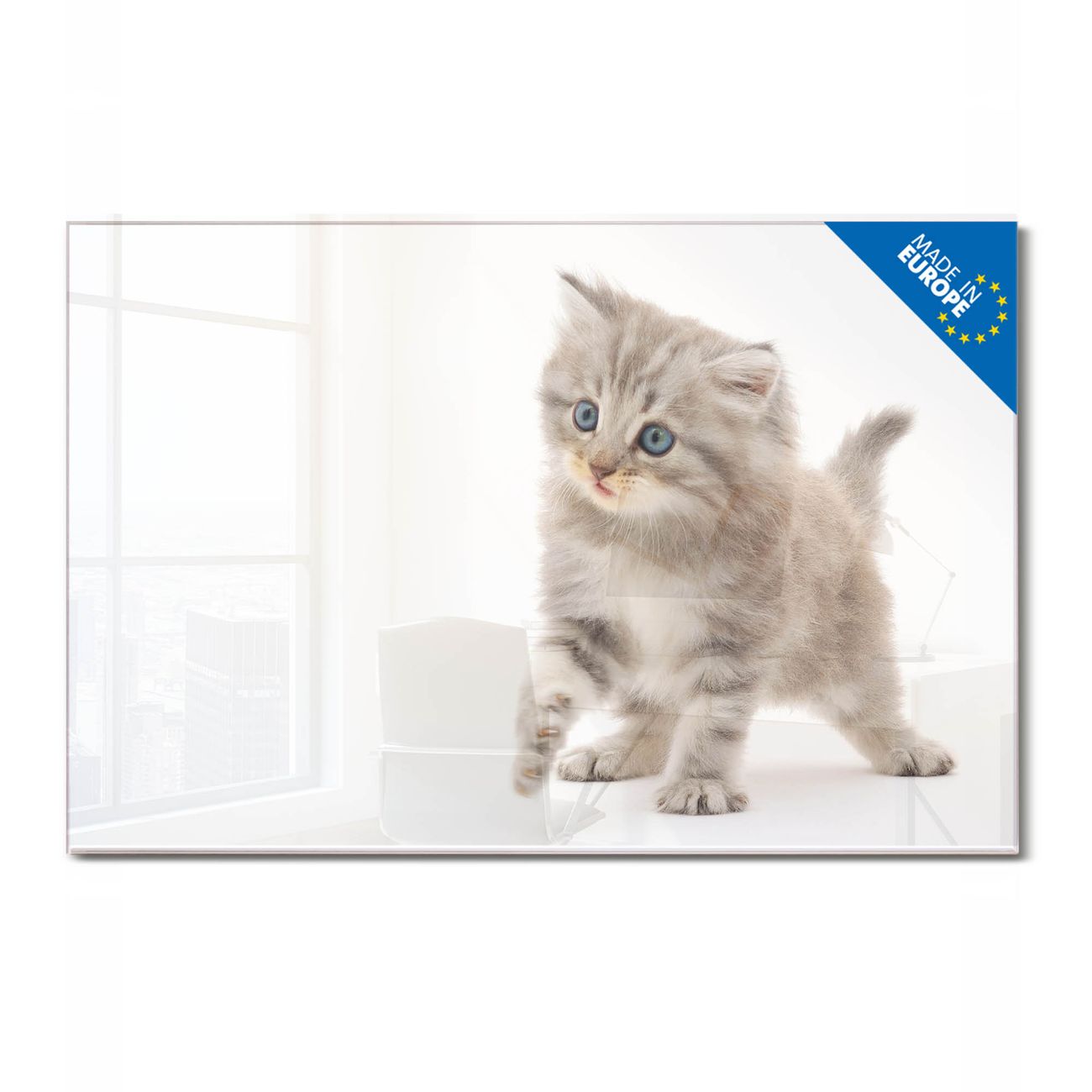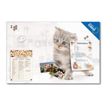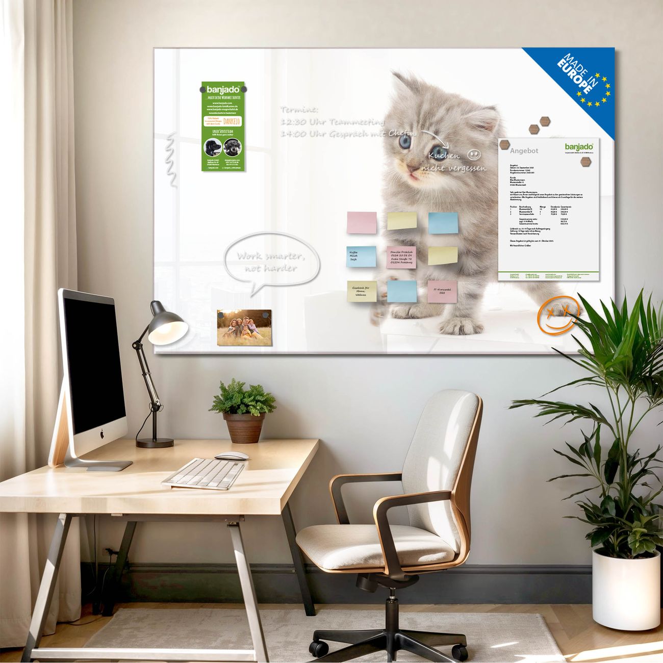 Material: 4mm Sicherheitsglas mit Metallrückwand Eigenschaften: beschreibbar, magnetisch, kratzfest Maße: 120x60x0,6cm, 10,80kg schwer Motiv Nummer 10223 Miau Zubehör: inklusive 4 Neodym-Magnete