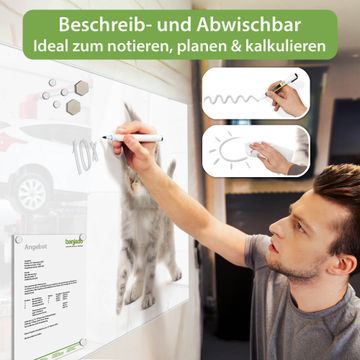 Auf der glatten Glasoberfläche lassen sich Termine, Rezepte oder Notizen ganz einfach mit Kreidestiften festhalten und rückstandslos entfernen. Starke Neodym-Magnete halten Ihre wichtigsten Erinnerungen sicher an Ort und Stelle. So entsteht Ihre ganz persönliche Ideenwand - jeden Tag neu.