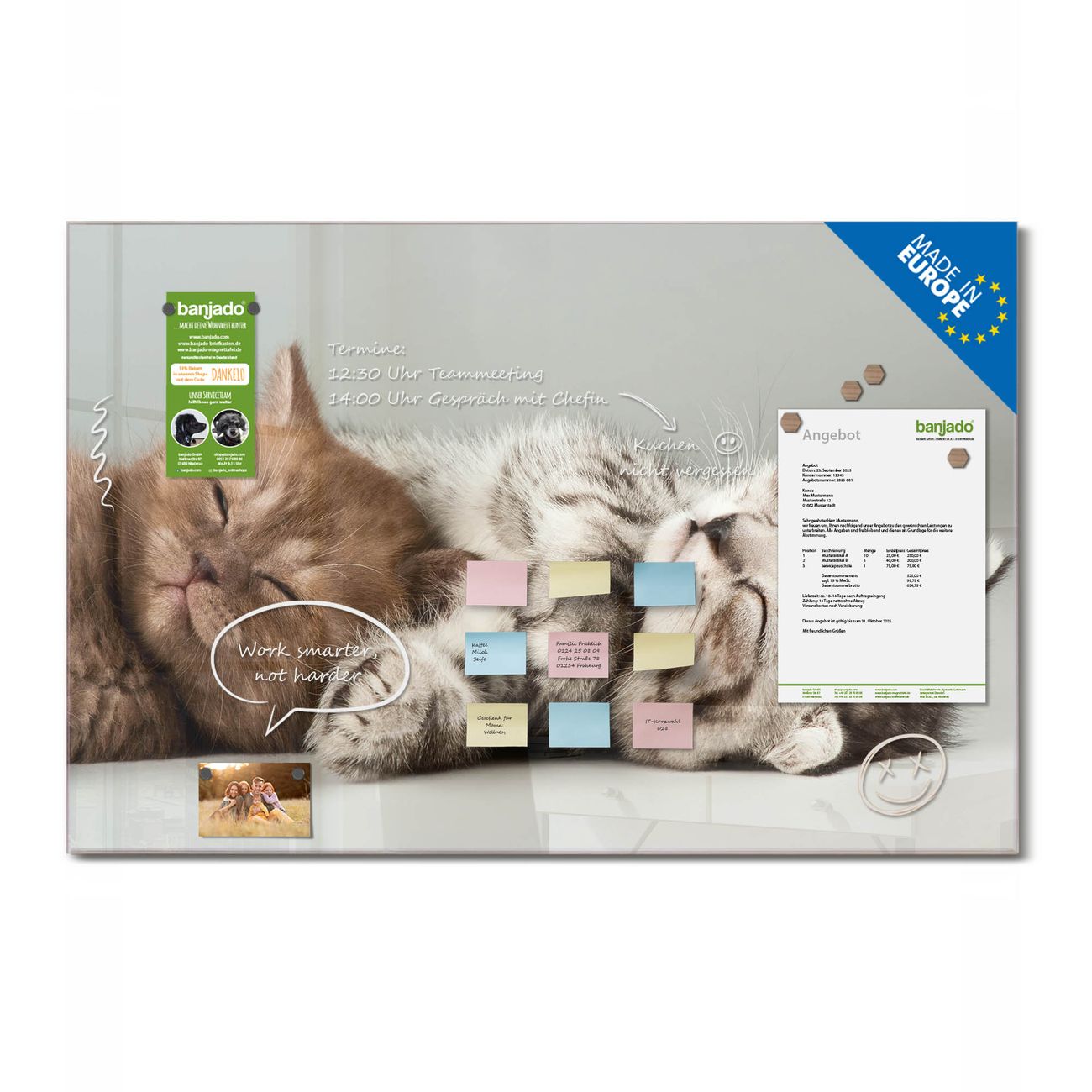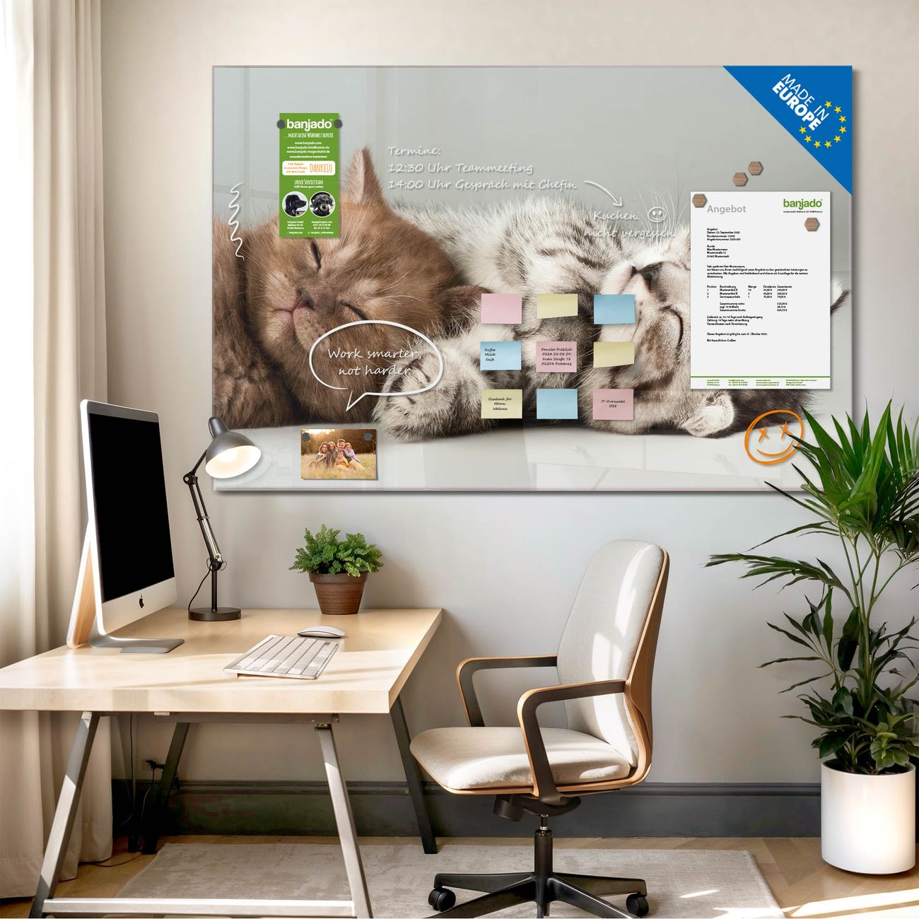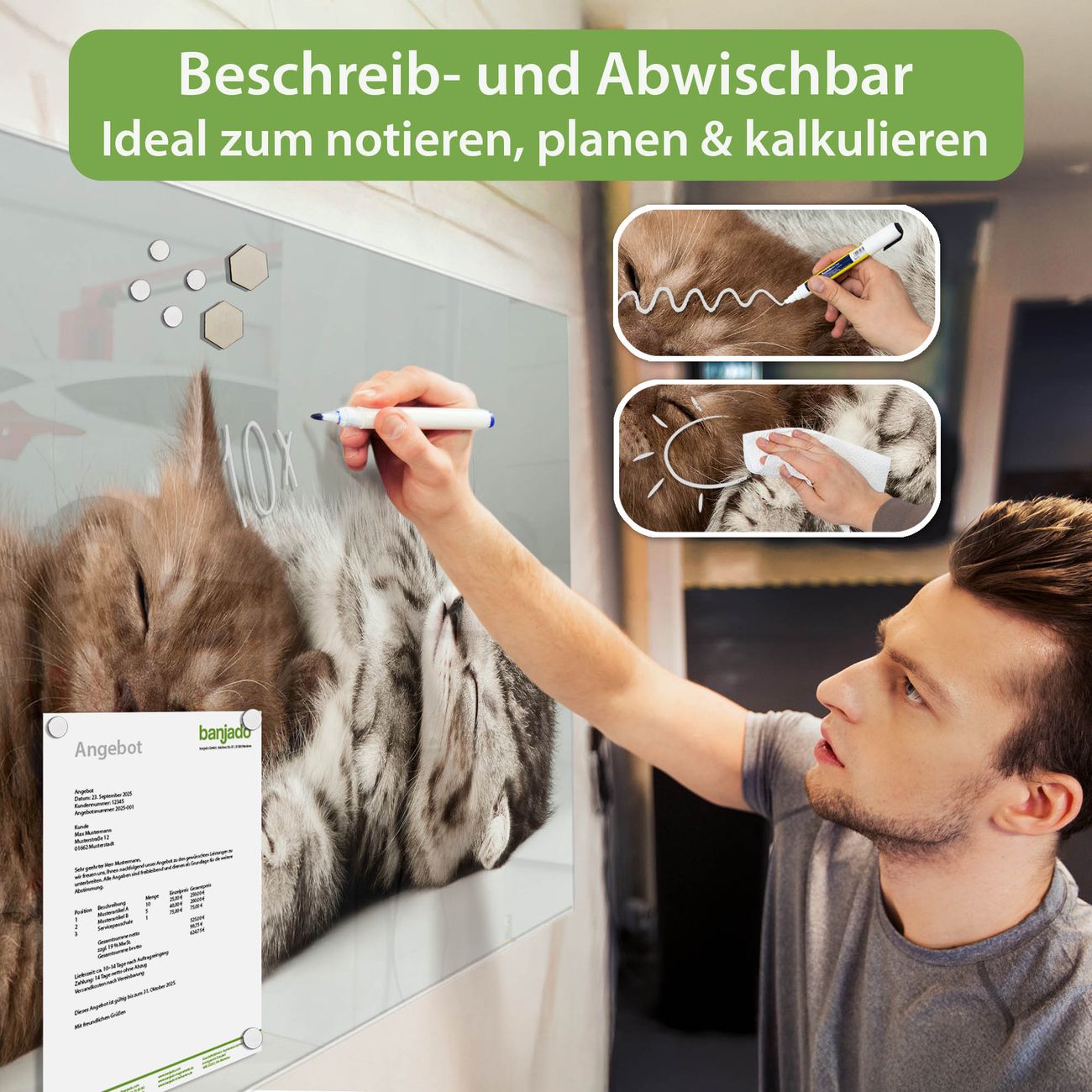 Jede Glas Magnettafel wird in unserer Werkstatt von Hand gefertigt und sorgfältig geprüft. So erhalten Sie ein echtes Qualitätsprodukt, das Funktion und Ästhetik perfekt vereint.?? Warum banjado?