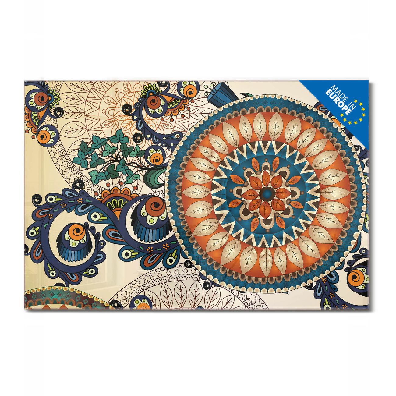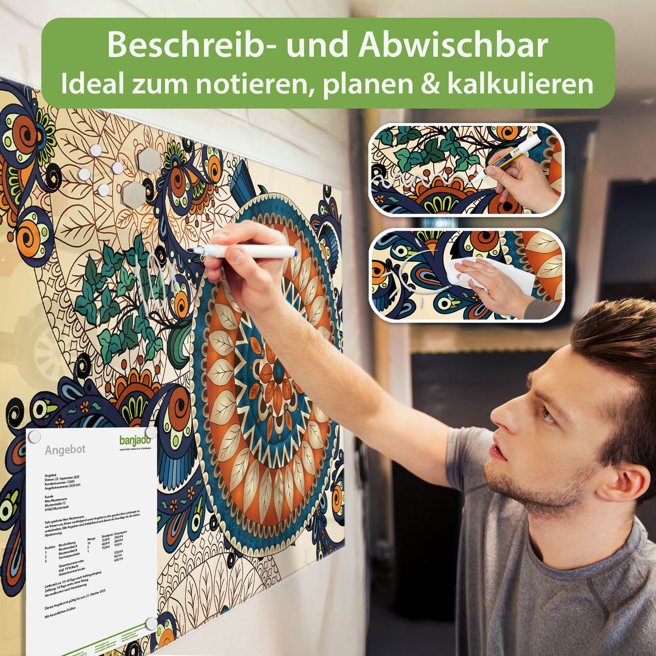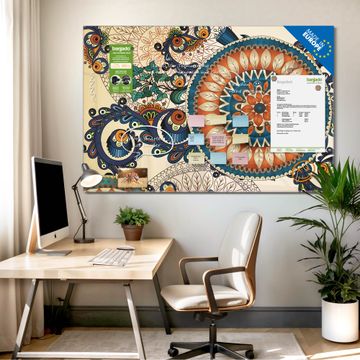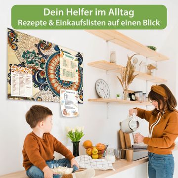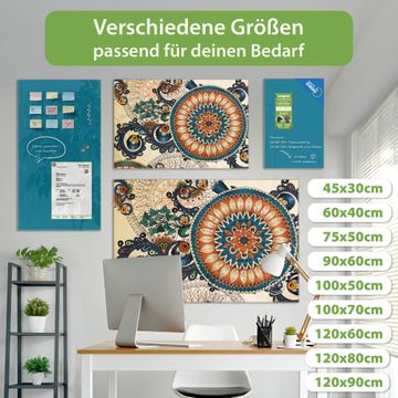 Material: 4mm Sicherheitsglas mit Metallrückwand Eigenschaften: beschreibbar, magnetisch, kratzfest Maße: 90x60x0,6cm, 8,10kg schwer Motiv Nummer 10984 Modernes Mandala Zubehör: inklusive 4 Neodym-Magnete
