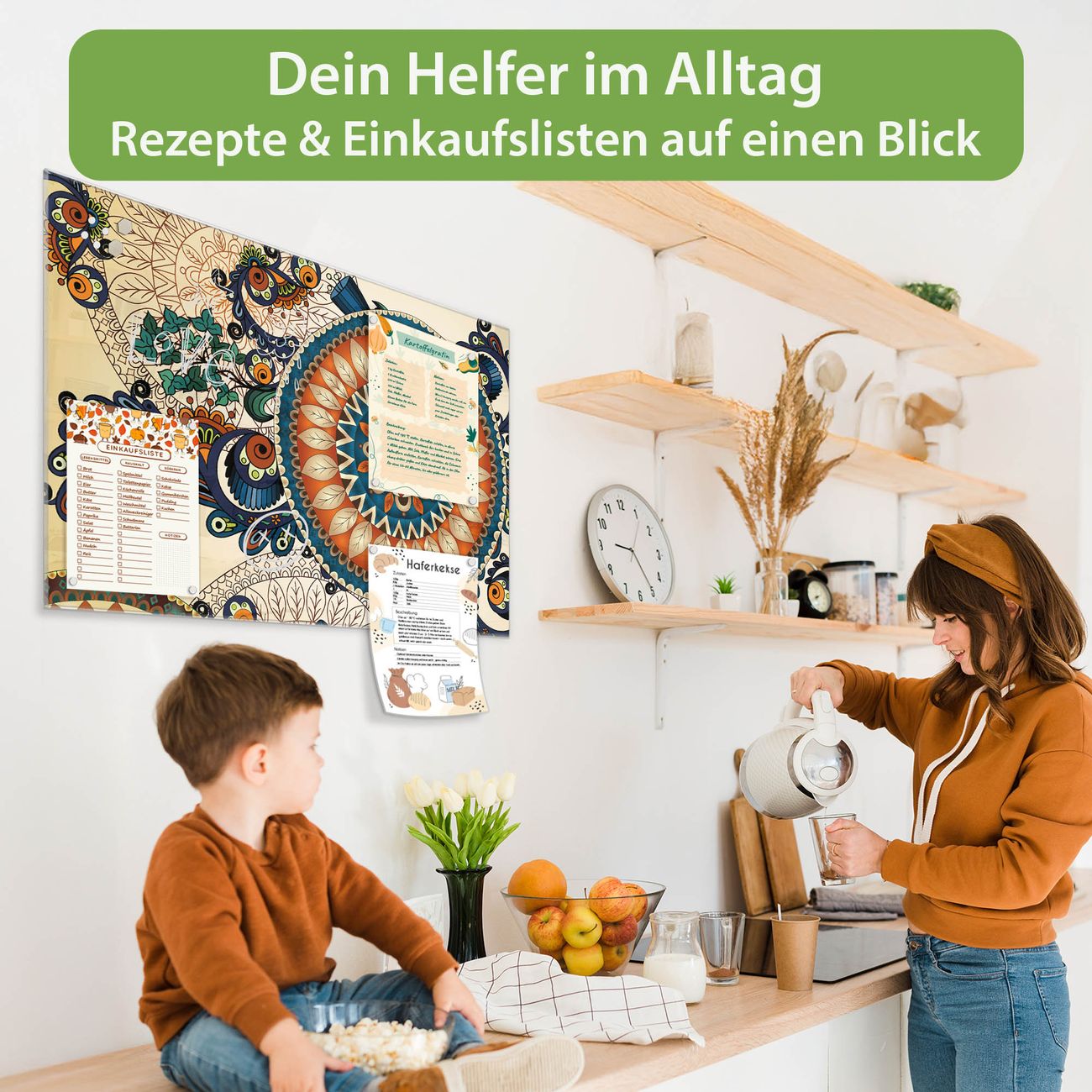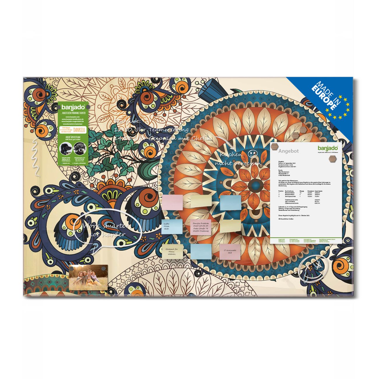 Ein Stück Design, das Ihren Alltag organisiert. Schreiben, heften, inspirieren - alles an einem Ort. Qualität, die man spürt. Montage leicht gemacht. Handwerk mit Herz - veredelt in Sachsen. Einzigartiges Design mit Motiv Motiv Modernes Mandala Beschreibbare Glasoberfläche, leicht zu reinigen Starke Magnetkraft durch Stahlrückwand Inklusive 4 Neodym-Magneten Flexible Montageoptionen Handveredelt in Sachsen - Qualität, die bleibt