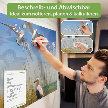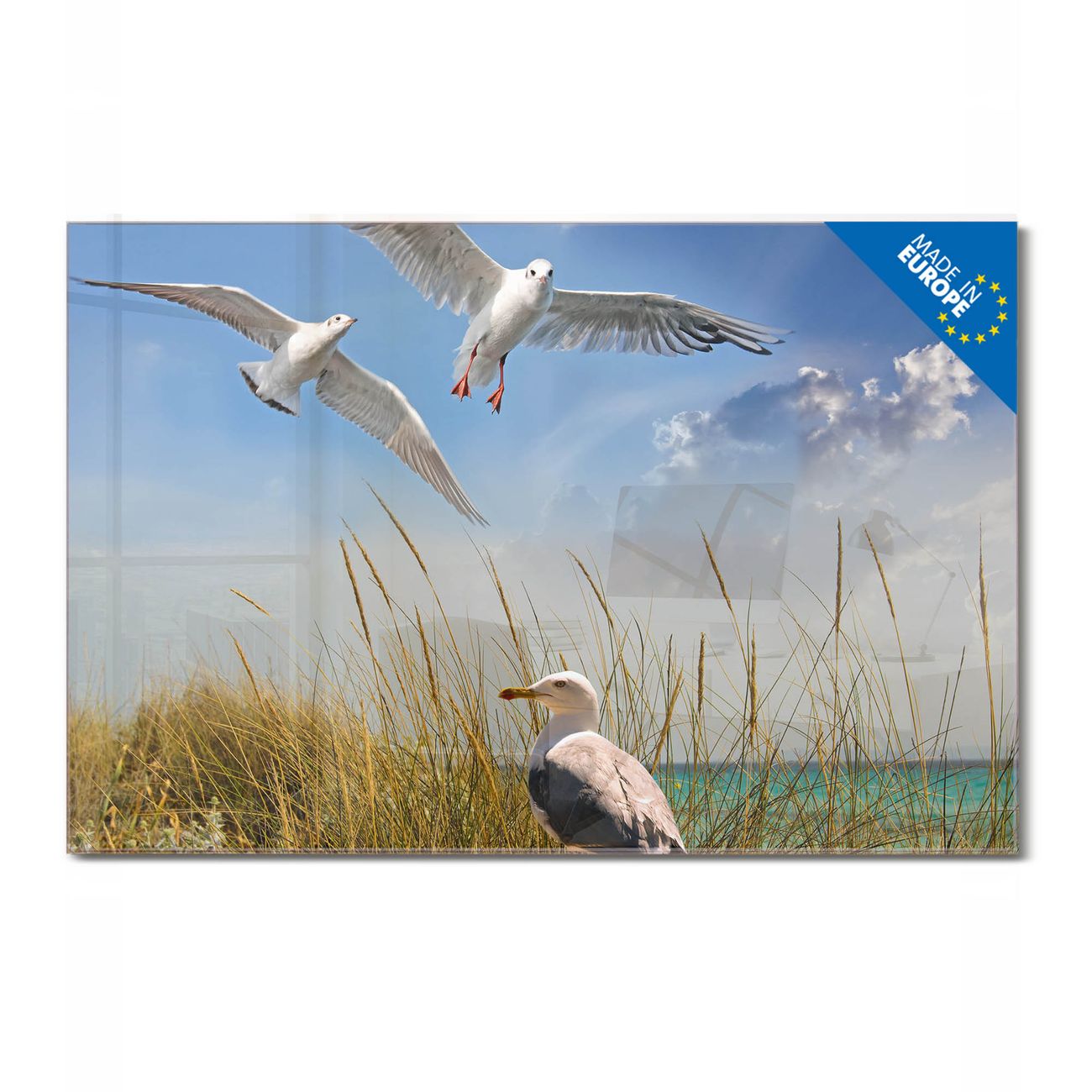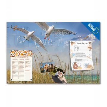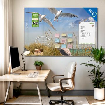 Material: 4mm Sicherheitsglas mit Metallrückwand Eigenschaften: beschreibbar, magnetisch, kratzfest Maße: 75x50x0,6cm, 5,63kg schwer Motiv Nummer 10494 Möwen Zubehör: inklusive 4 Neodym-Magnete