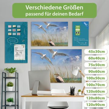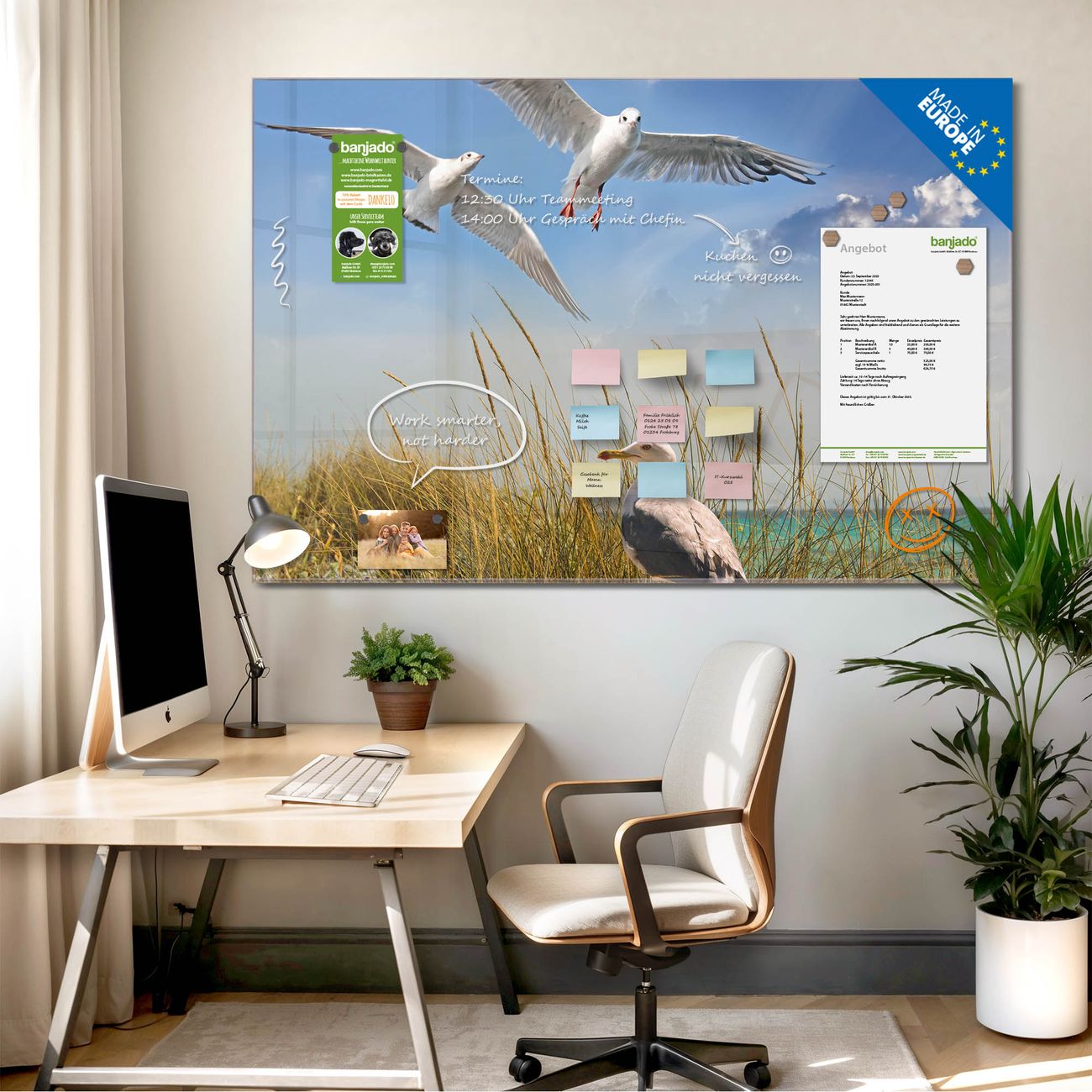 Die banjado Glas Magnettafel mit dem Motiv Motiv Möwen verbindet Funktionalität mit Stil. Sie ersetzt das Zettelchaos durch klare Strukturen und bringt dabei eine warme, natürliche Atmosphäre in Ihr Zuhause. Ob im Büro, in der Küche oder im Eingangsbereich - dieses Design-Board zieht Blicke an und sorgt für Ordnung mit Charakter.