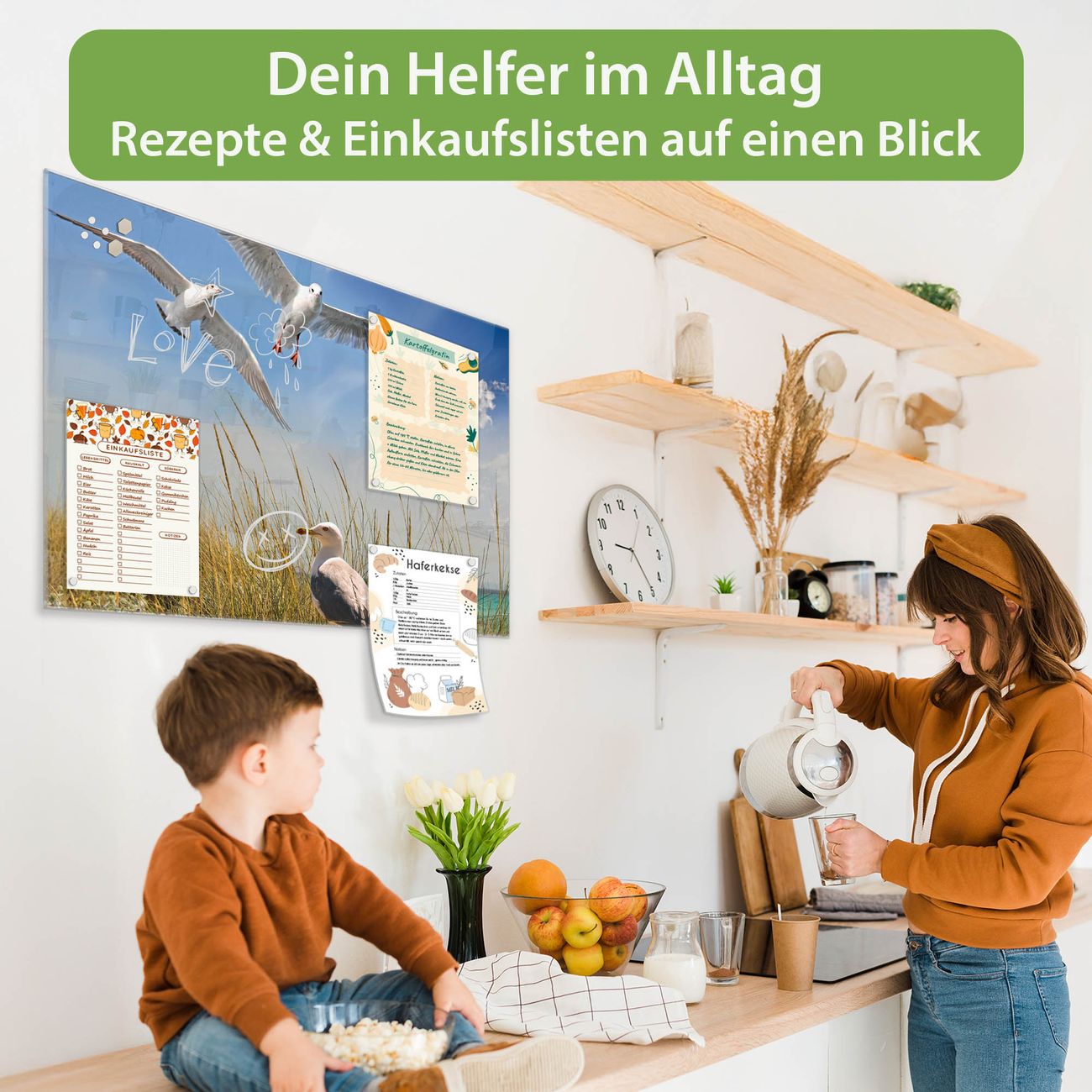 Ein Stück Design, das Ihren Alltag organisiert. Schreiben, heften, inspirieren - alles an einem Ort. Qualität, die man spürt. Montage leicht gemacht. Handwerk mit Herz - veredelt in Sachsen. Einzigartiges Design mit Motiv Motiv Möwen Beschreibbare Glasoberfläche, leicht zu reinigen Starke Magnetkraft durch Stahlrückwand Inklusive 4 Neodym-Magneten Flexible Montageoptionen Handveredelt in Sachsen - Qualität, die bleibt