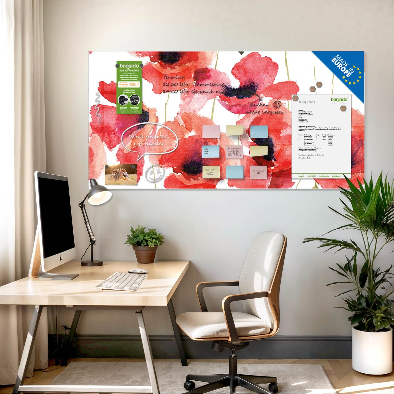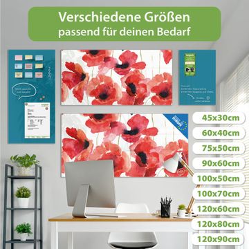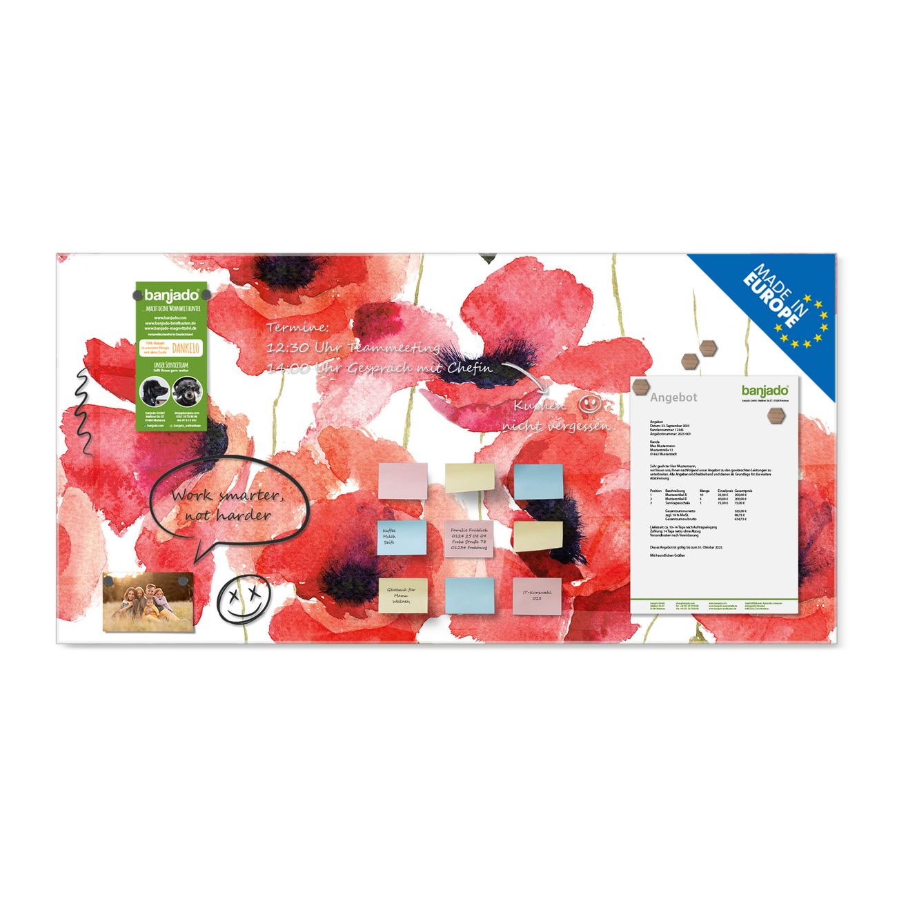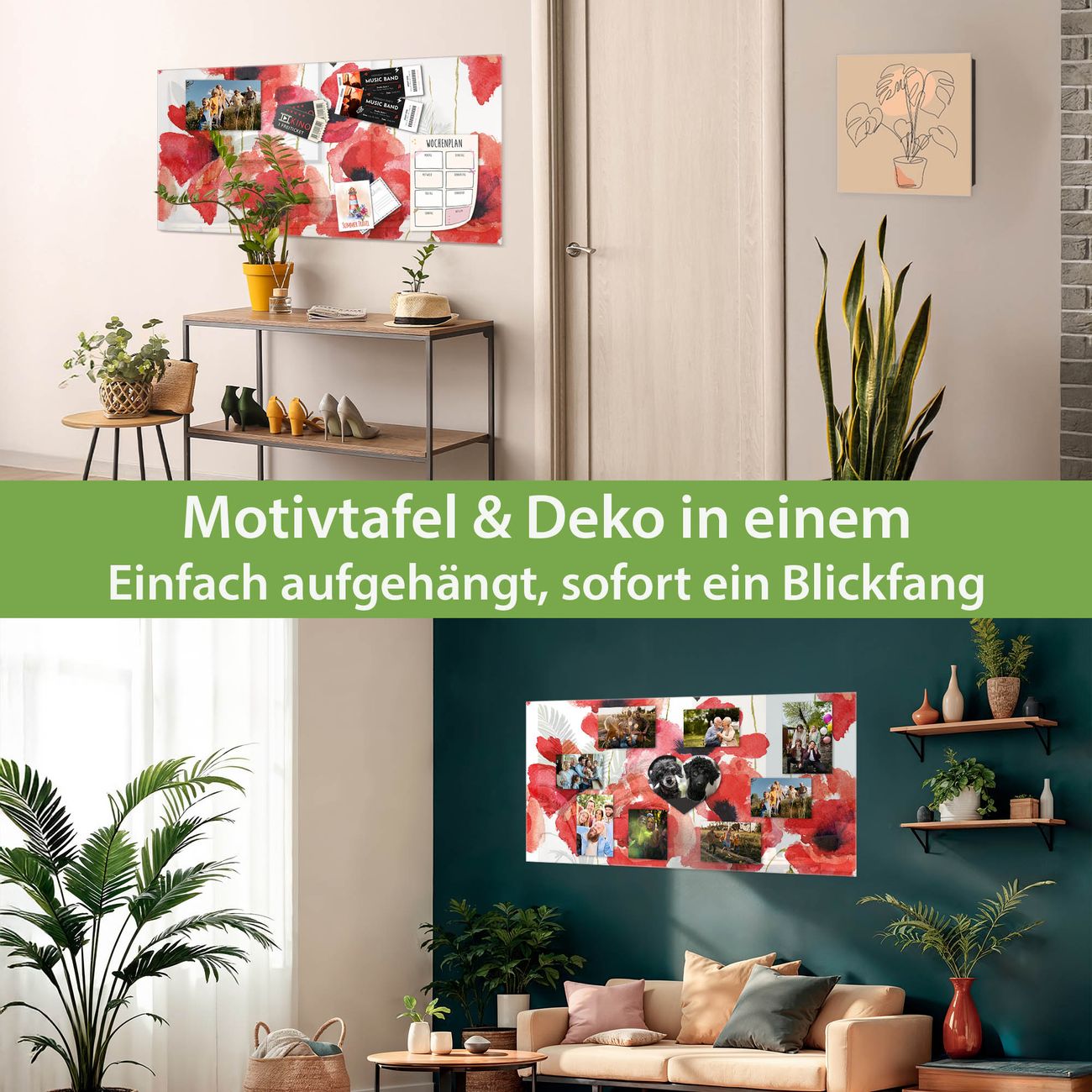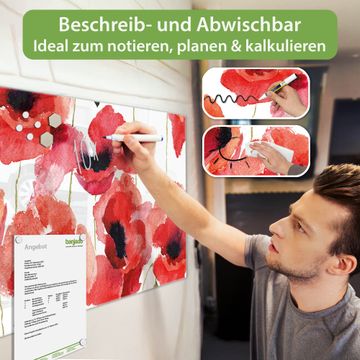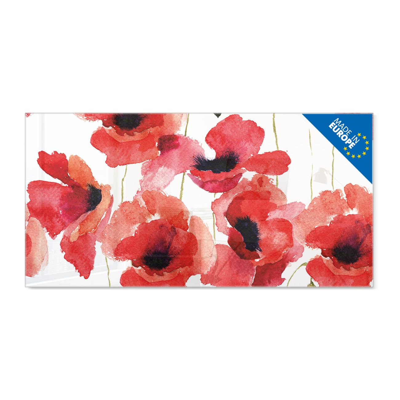 Material: 4mm Sicherheitsglas mit Metallrückwand Eigenschaften: beschreibbar, magnetisch, kratzfest Maße: 120x60x0,6cm, 10,80kg schwer Motiv Nummer 12326 Mohn Aquarell Zubehör: inklusive 4 Neodym-Magnete