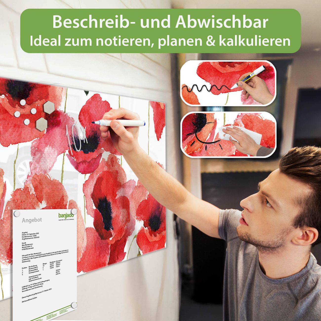 Die banjado Glas Magnettafel mit dem Motiv Motiv Mohn Aquarell verbindet Funktionalität mit Stil. Sie ersetzt das Zettelchaos durch klare Strukturen und bringt dabei eine warme, natürliche Atmosphäre in Ihr Zuhause. Ob im Büro, in der Küche oder im Eingangsbereich - dieses Design-Board zieht Blicke an und sorgt für Ordnung mit Charakter.