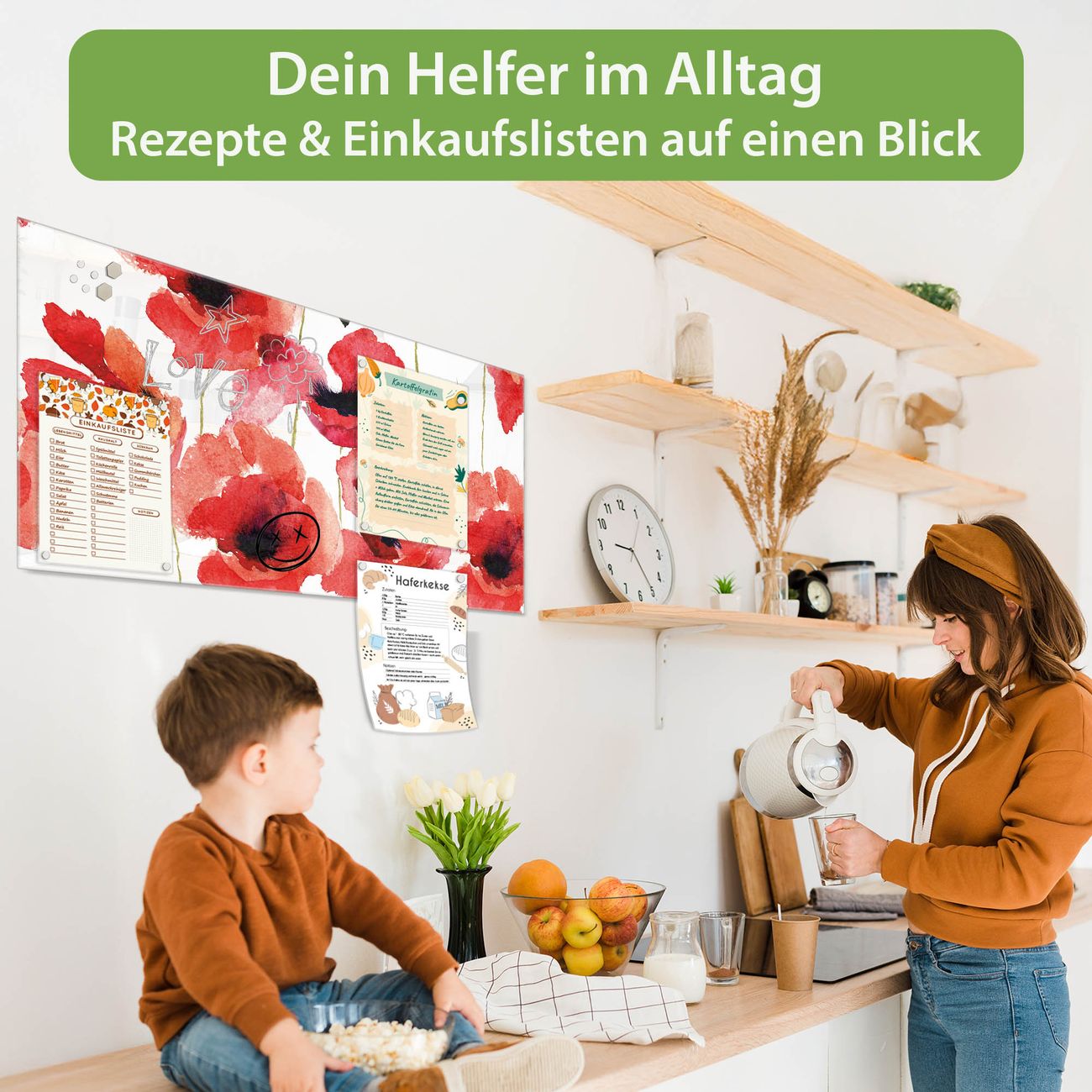 Ein Stück Design, das Ihren Alltag organisiert. Schreiben, heften, inspirieren - alles an einem Ort. Qualität, die man spürt. Montage leicht gemacht. Handwerk mit Herz - veredelt in Sachsen. Einzigartiges Design mit Motiv Motiv Mohn Aquarell Beschreibbare Glasoberfläche, leicht zu reinigen Starke Magnetkraft durch Stahlrückwand Inklusive 4 Neodym-Magneten Flexible Montageoptionen Handveredelt in Sachsen - Qualität, die bleibt