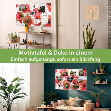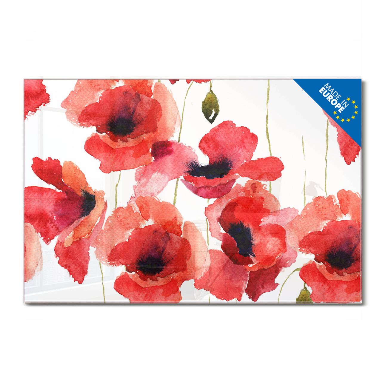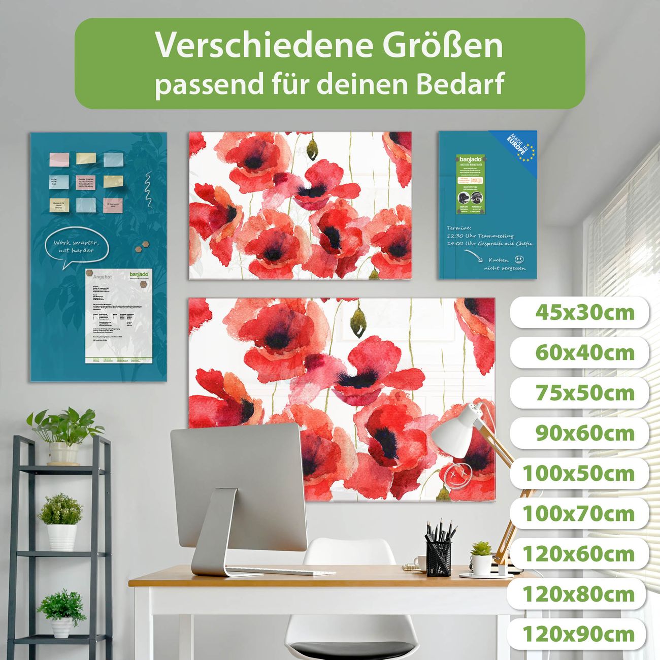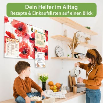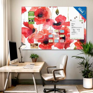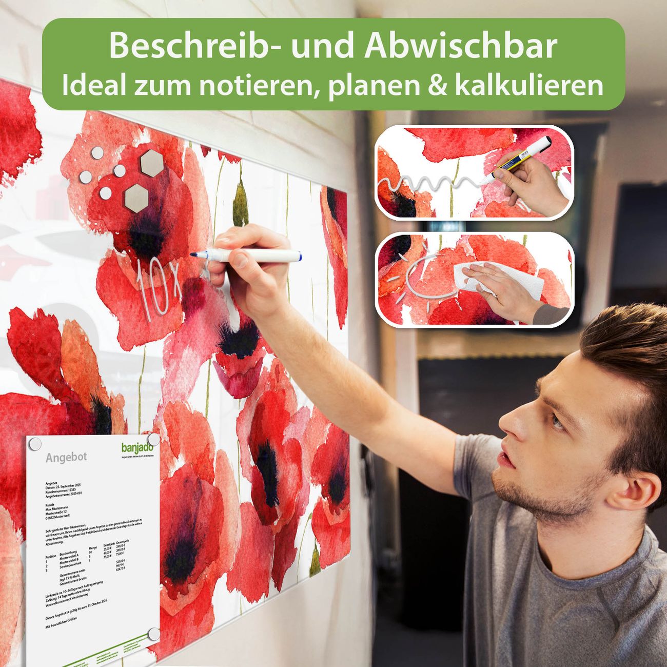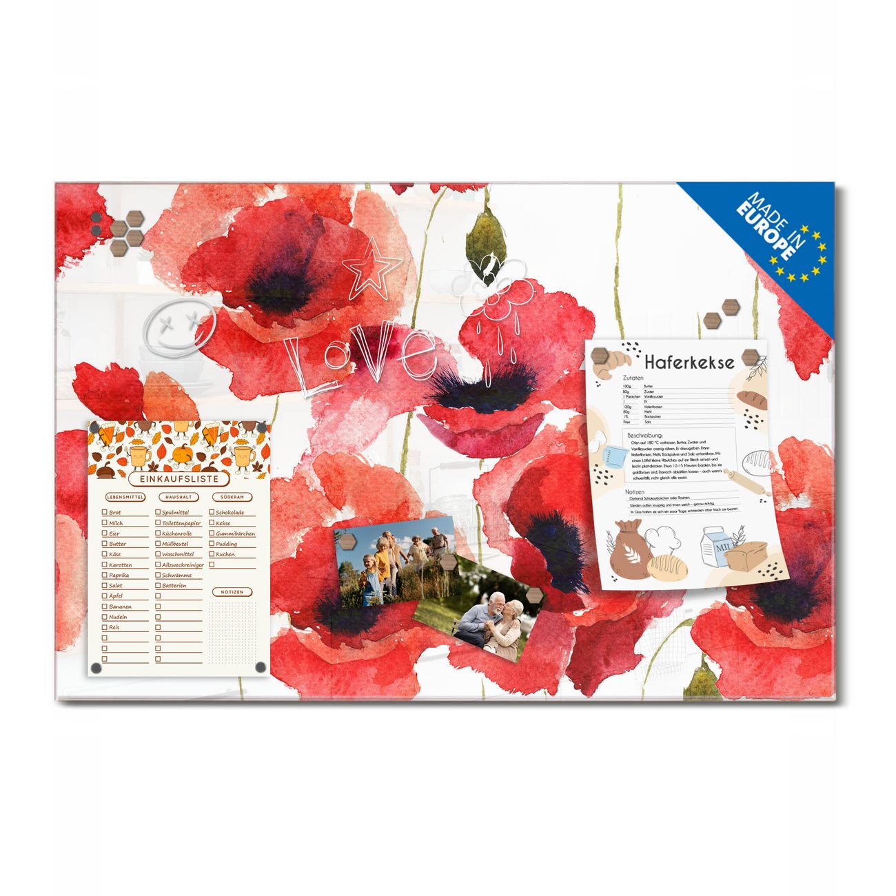 Material: 4mm Sicherheitsglas mit Metallrückwand Eigenschaften: beschreibbar, magnetisch, kratzfest Maße: 75x50x0,6cm, 5,63kg schwer Motiv Nummer 12326 Mohn Aquarell Zubehör: inklusive 4 Neodym-Magnete