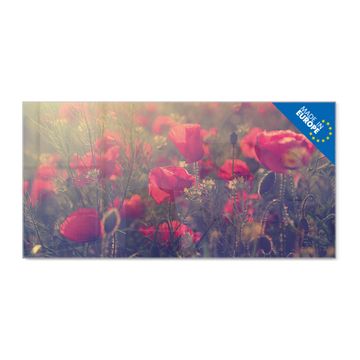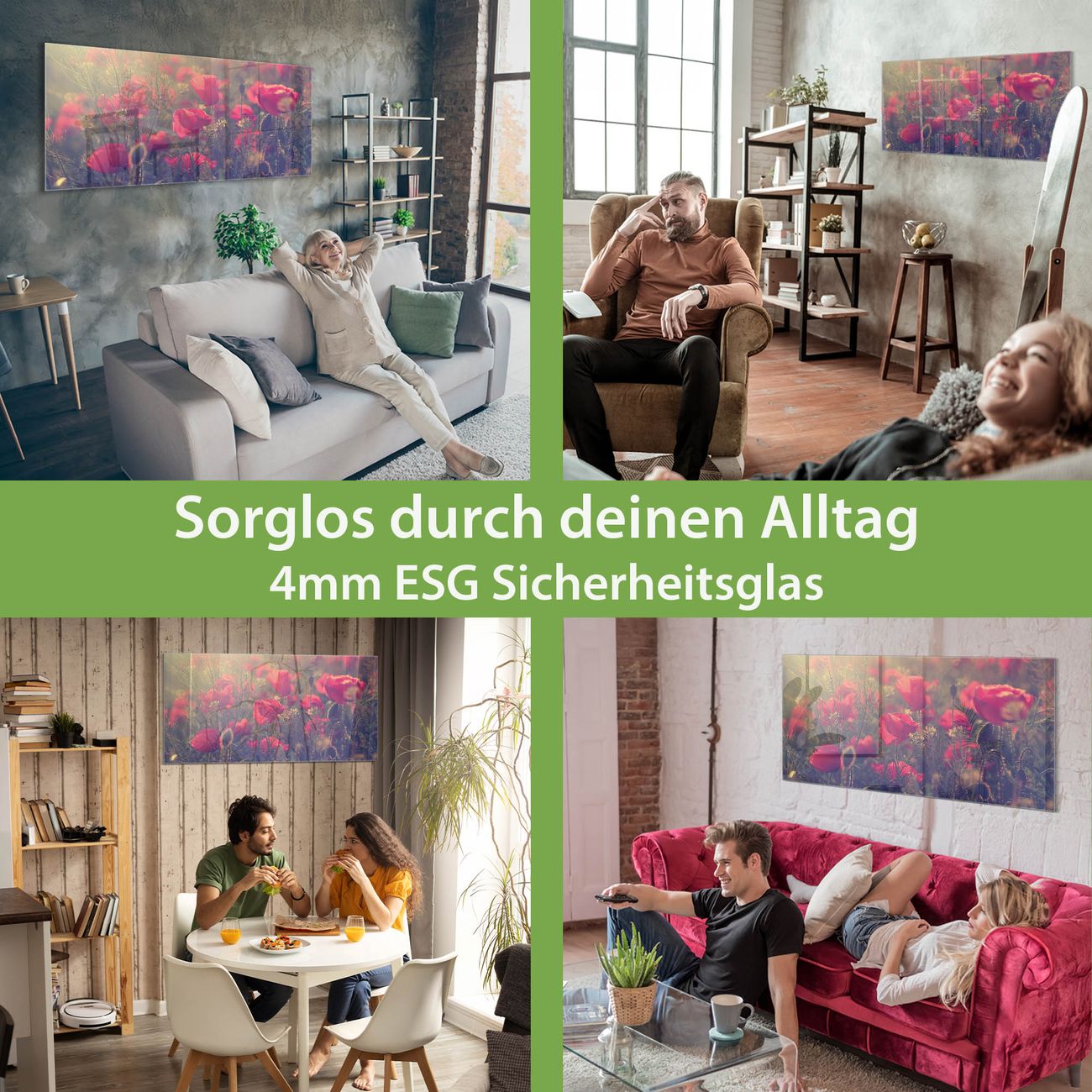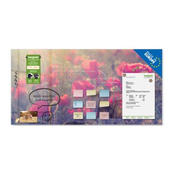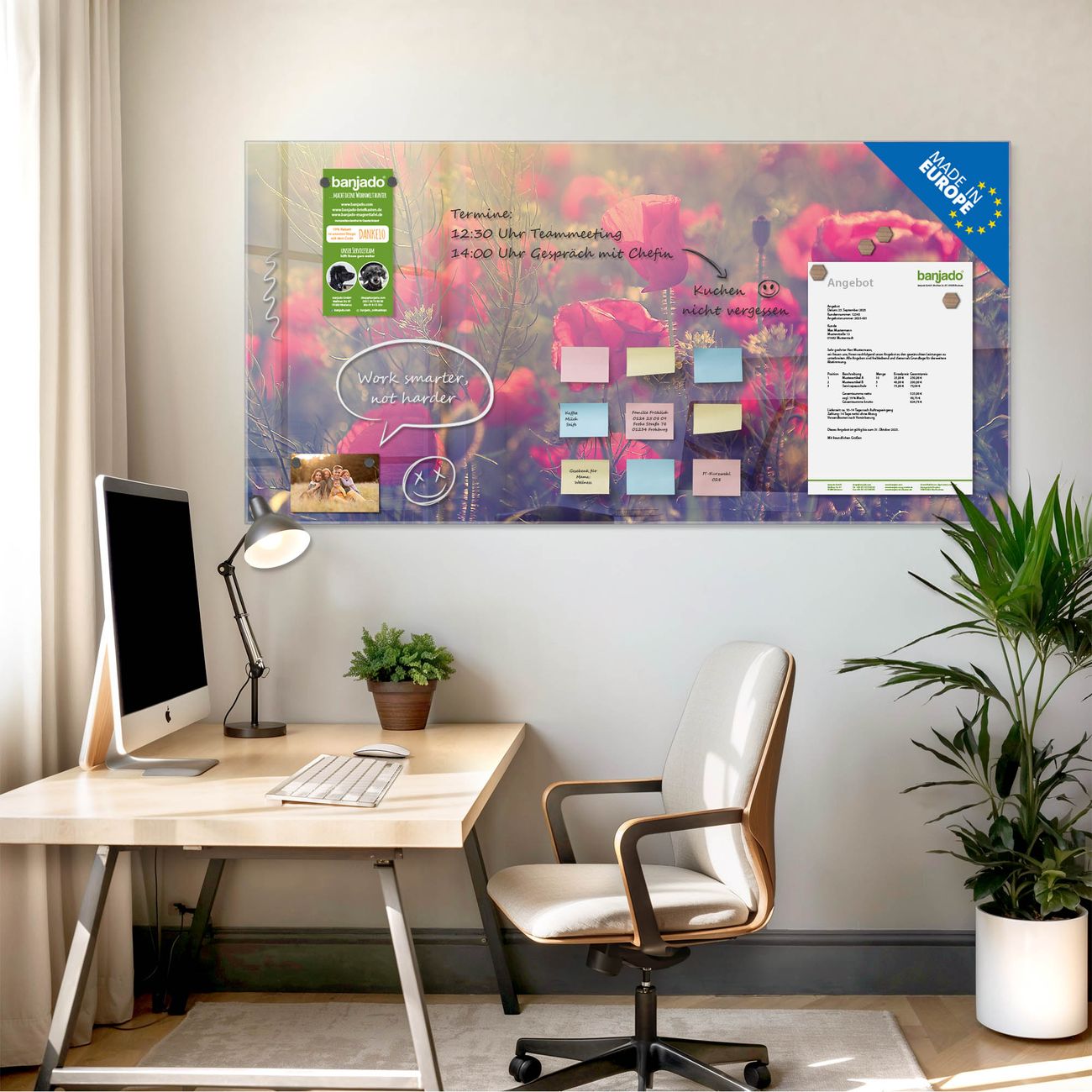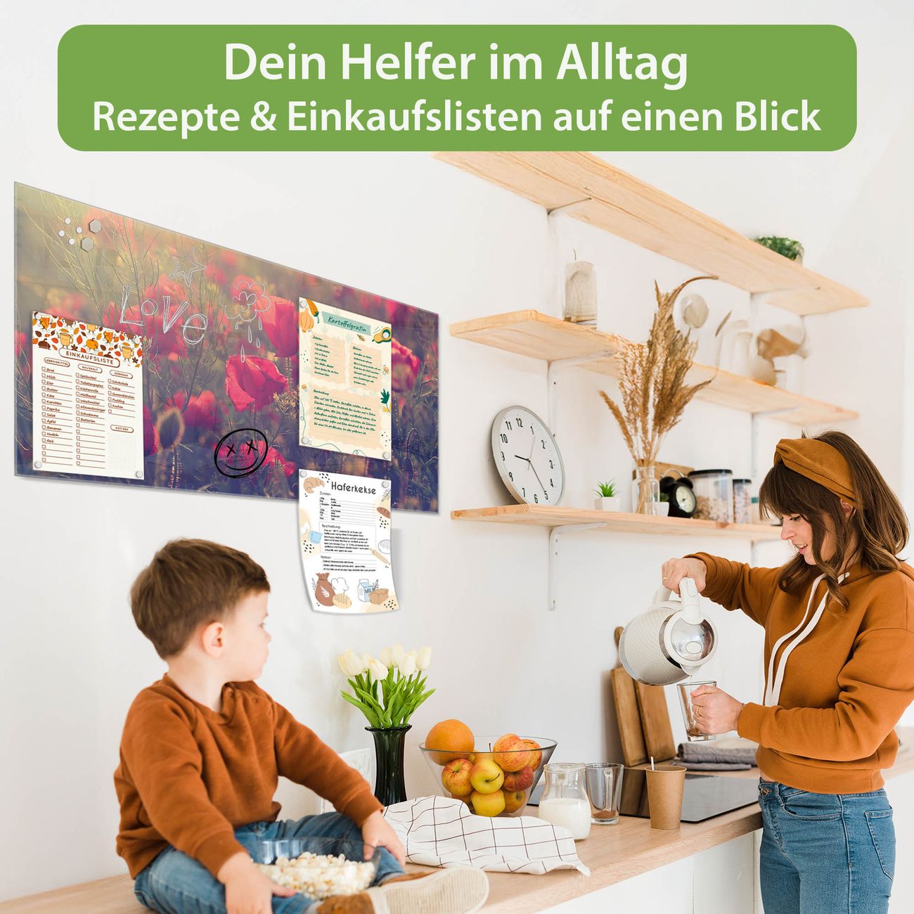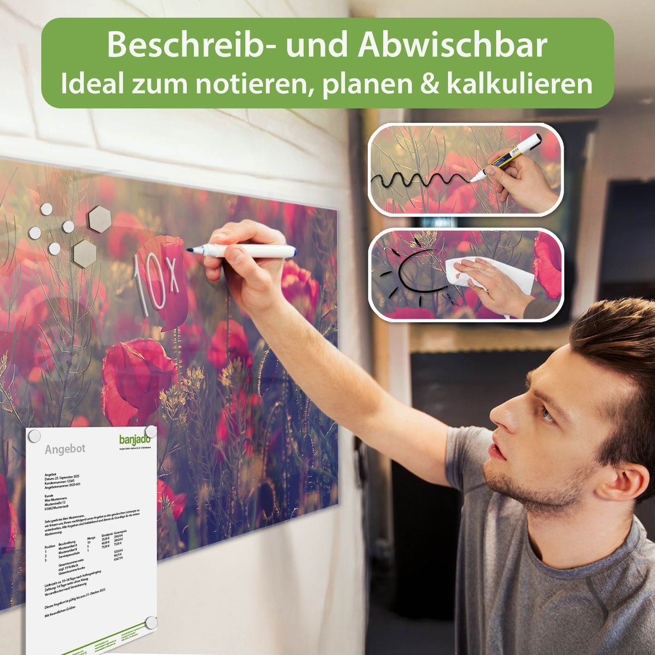 Material: 4mm Sicherheitsglas mit Metallrückwand Eigenschaften: beschreibbar, magnetisch, kratzfest Maße: 100x50x0,6cm, 7,50kg schwer Motiv Nummer 11632 Mohn Zubehör: inklusive 4 Neodym-Magnete
