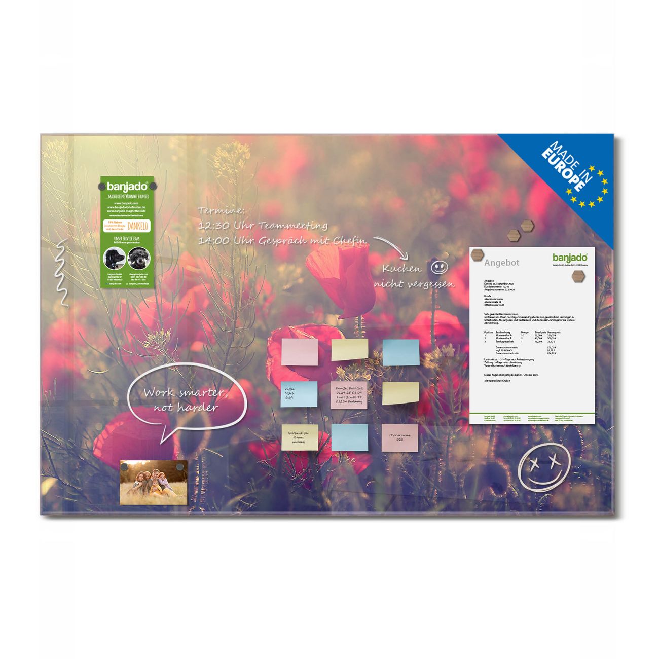 Jede Glas Magnettafel wird in unserer Werkstatt von Hand gefertigt und sorgfältig geprüft. So erhalten Sie ein echtes Qualitätsprodukt, das Funktion und Ästhetik perfekt vereint.?? Warum banjado?