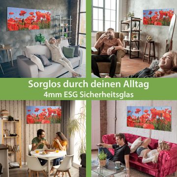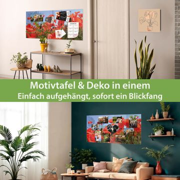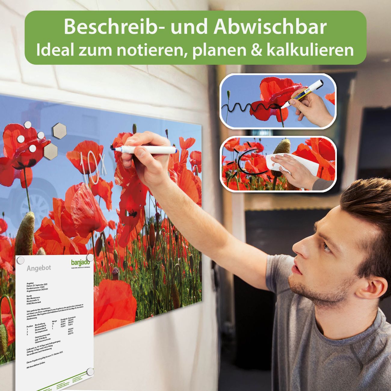 Material: 4mm Sicherheitsglas mit Metallrückwand Eigenschaften: beschreibbar, magnetisch, kratzfest Maße: 120x60x0,6cm, 10,80kg schwer Motiv Nummer 10078 Mohnblumen Zubehör: inklusive 4 Neodym-Magnete