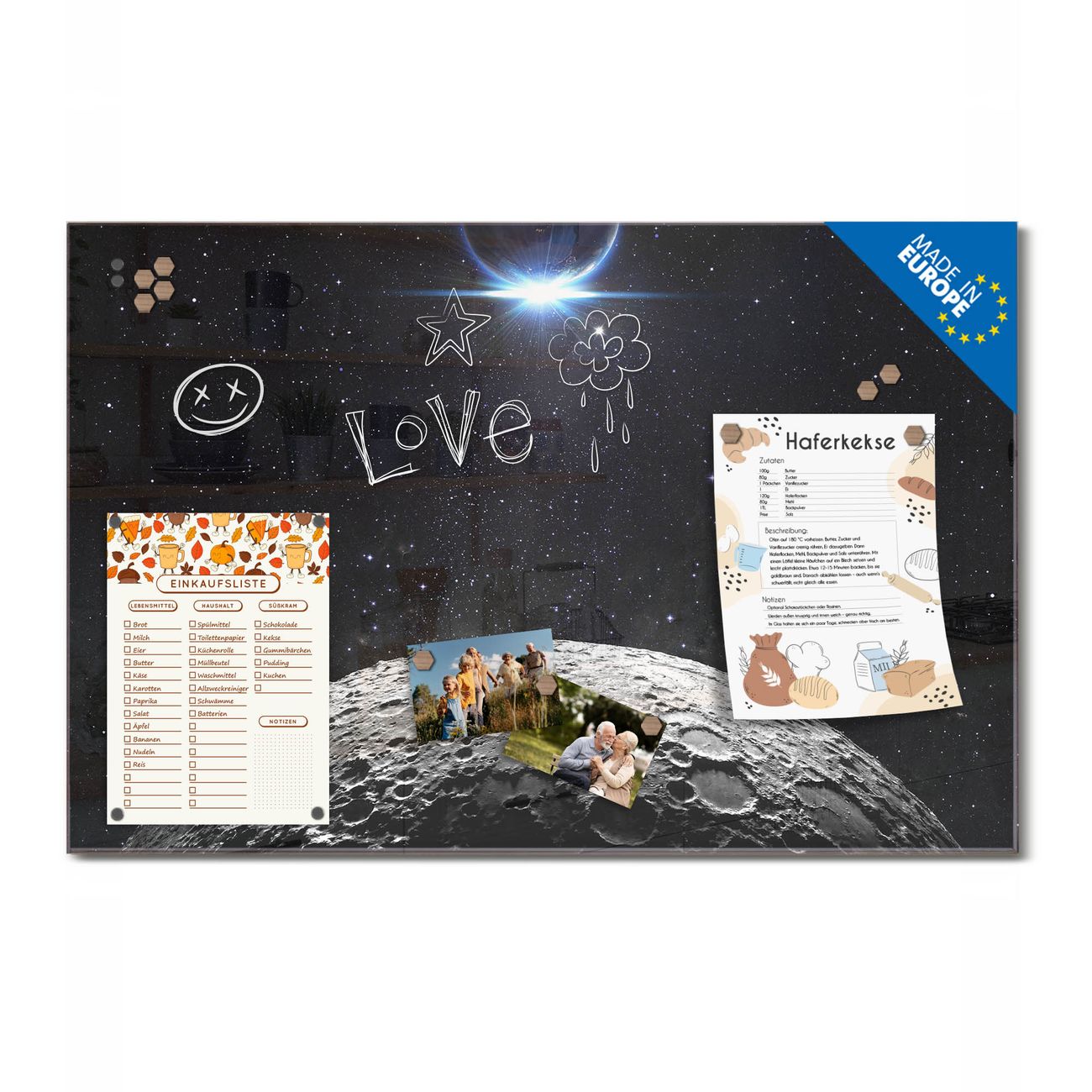 Ein Stück Design, das Ihren Alltag organisiert. Schreiben, heften, inspirieren - alles an einem Ort. Qualität, die man spürt. Montage leicht gemacht. Handwerk mit Herz - veredelt in Sachsen. Einzigartiges Design mit Motiv Motiv Mondlandschaft Beschreibbare Glasoberfläche, leicht zu reinigen Starke Magnetkraft durch Stahlrückwand Inklusive 4 Neodym-Magneten Flexible Montageoptionen Handveredelt in Sachsen - Qualität, die bleibt