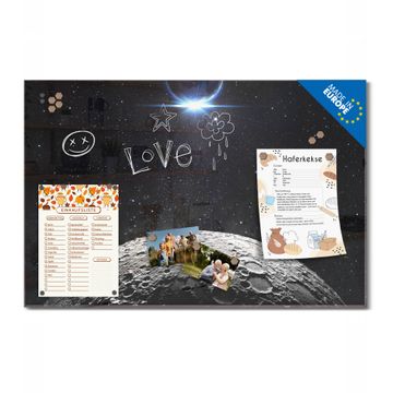 Material: 4mm Sicherheitsglas mit Metallrückwand Eigenschaften: beschreibbar, magnetisch, kratzfest Maße: 75x50x0,6cm, 5,63kg schwer Motiv Nummer 12533 Mondlandschaft Zubehör: inklusive 4 Neodym-Magnete