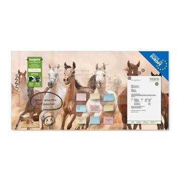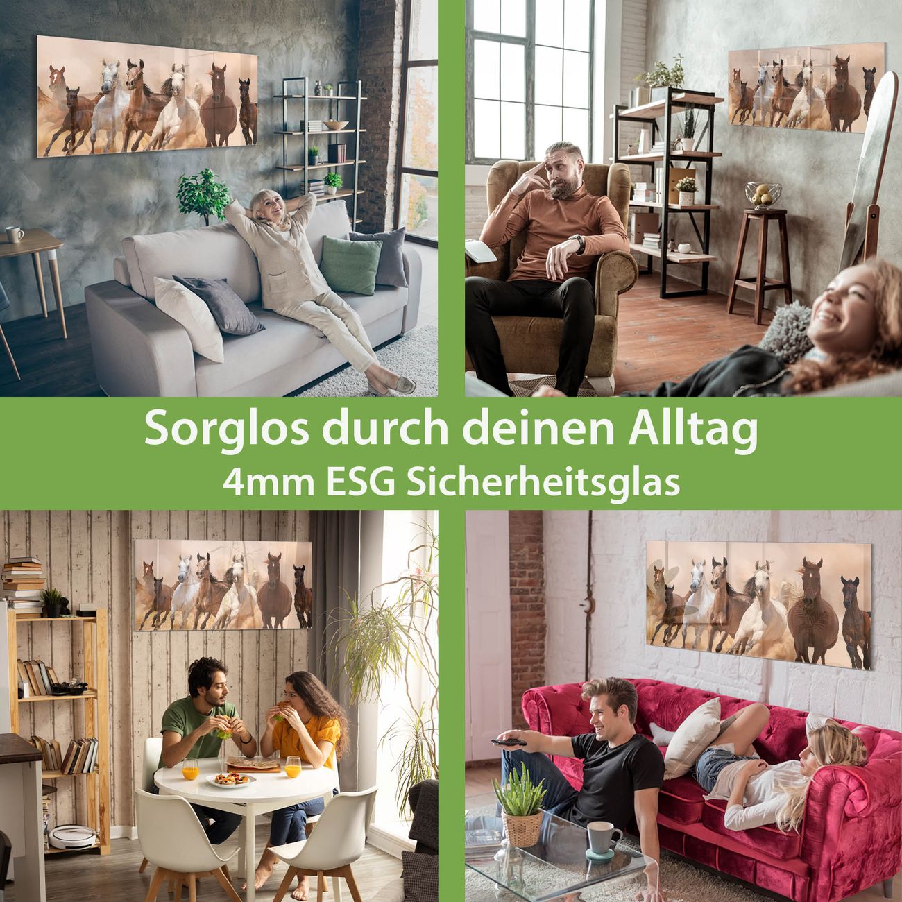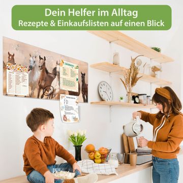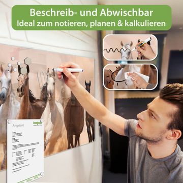 Material: 4mm Sicherheitsglas mit Metallrückwand Eigenschaften: beschreibbar, magnetisch, kratzfest Maße: 110x55x0,6cm, 9,08kg schwer Motiv Nummer 11128 Mongolische Stimmung Zubehör: inklusive 4 Neodym-Magnete