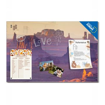 Material: 4mm Sicherheitsglas mit Metallrückwand Eigenschaften: beschreibbar, magnetisch, kratzfest Maße: 75x50x0,6cm, 5,63kg schwer Motiv Nummer 11477 Monument Valley Zubehör: inklusive 4 Neodym-Magnete