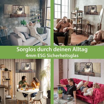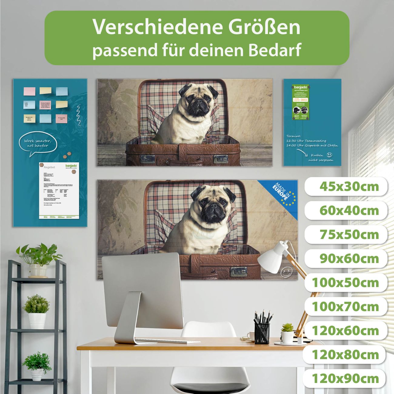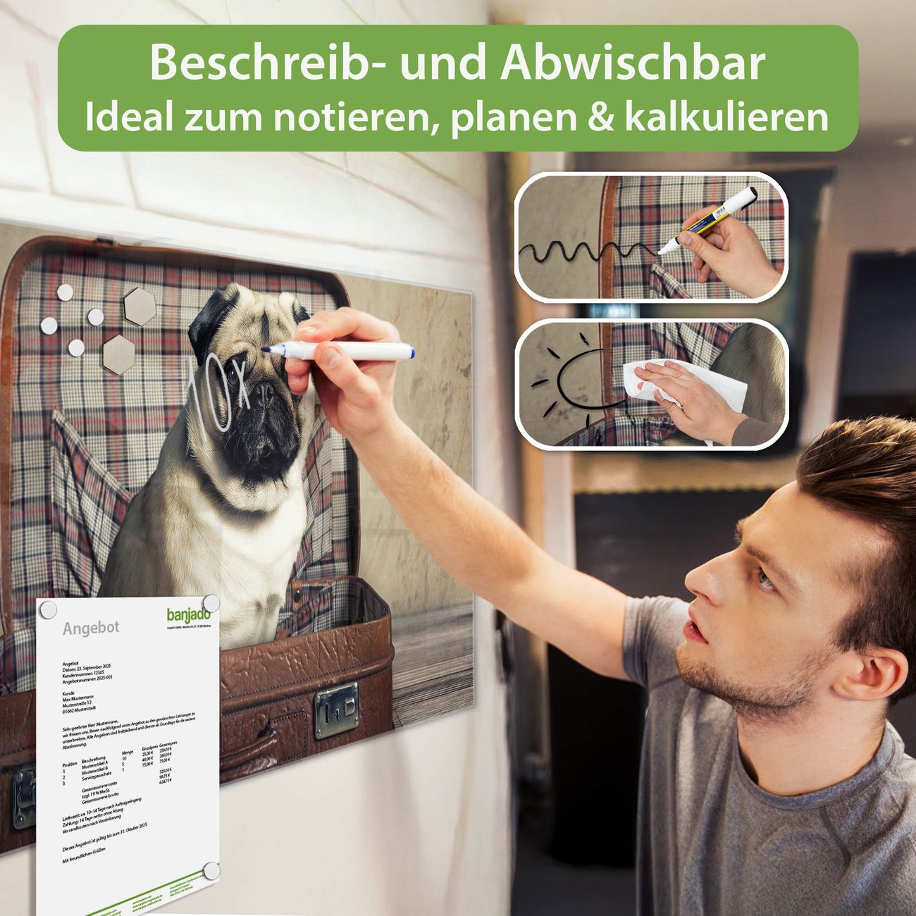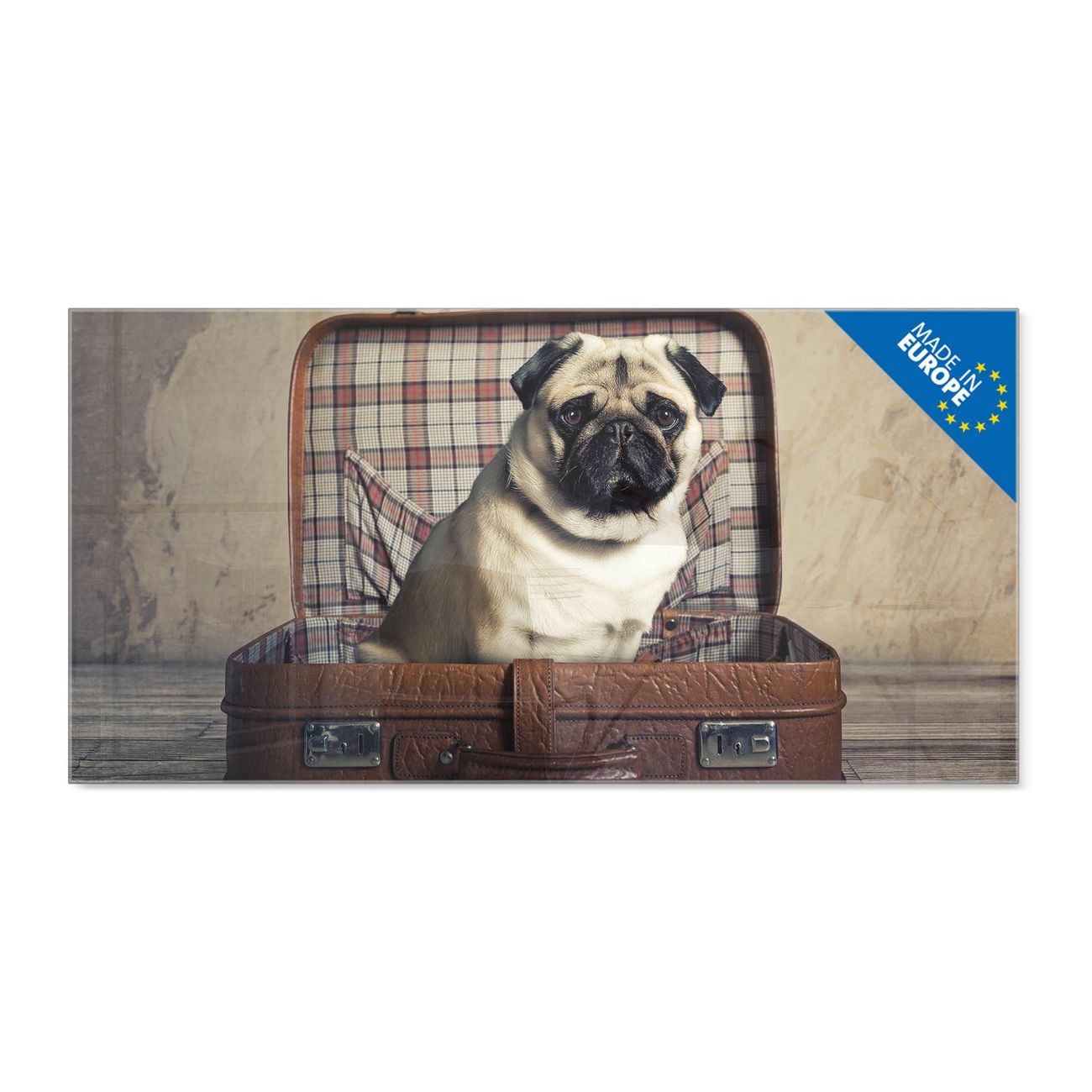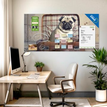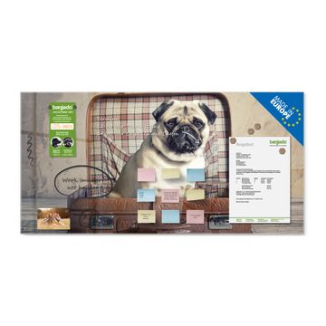 Material: 4mm Sicherheitsglas mit Metallrückwand Eigenschaften: beschreibbar, magnetisch, kratzfest Maße: 100x50x0,6cm, 7,50kg schwer Motiv Nummer 12506 Mops im Koffer Zubehör: inklusive 4 Neodym-Magnete