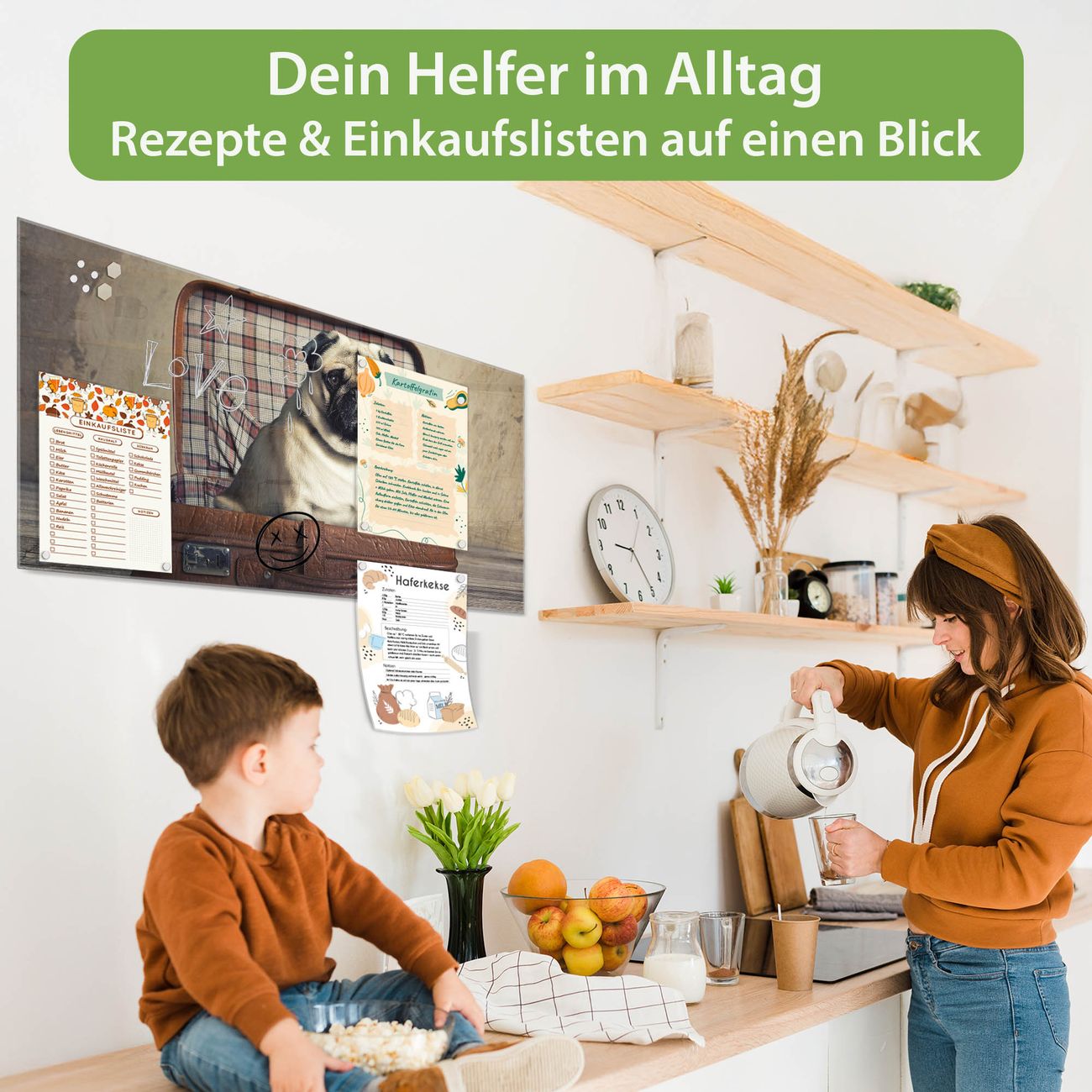 Auf der glatten Glasoberfläche lassen sich Termine, Rezepte oder Notizen ganz einfach mit Kreidestiften festhalten und rückstandslos entfernen. Starke Neodym-Magnete halten Ihre wichtigsten Erinnerungen sicher an Ort und Stelle. So entsteht Ihre ganz persönliche Ideenwand - jeden Tag neu.