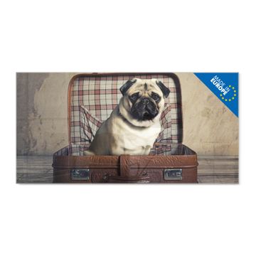 Glas Magnettafel im Querformat Motiv Mops im Koffer