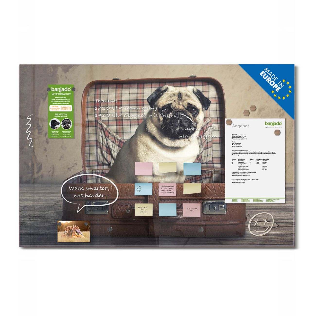 Glas Magnettafel im Querformat Motiv Mops im Koffer