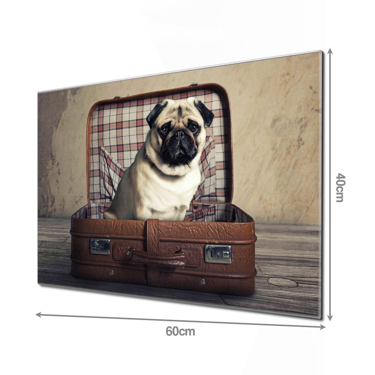 Material: 4mm Sicherheitsglas mit Metallrückwand Eigenschaften: beschreibbar, magnetisch, kratzfest Maße: 60x40x0,6cm, 3,6kg schwer Motiv Nummer 12506 Mops im Koffer Zubehör: inklusive 4 Neodym-Magnete