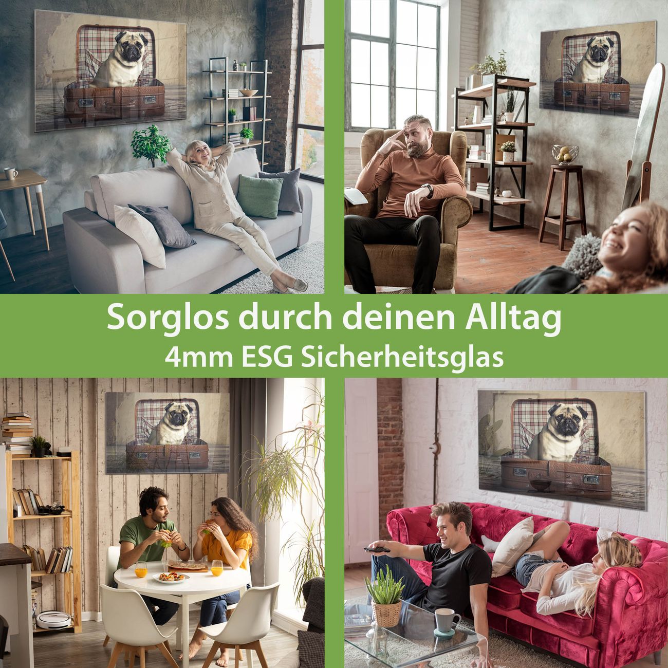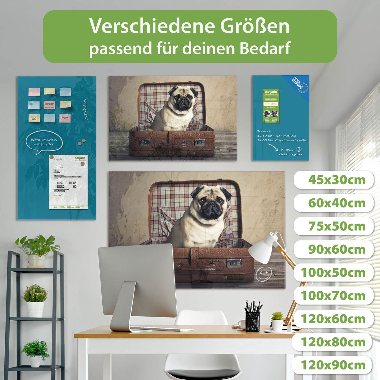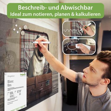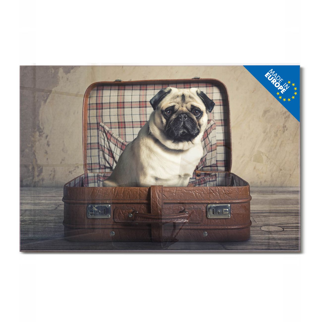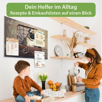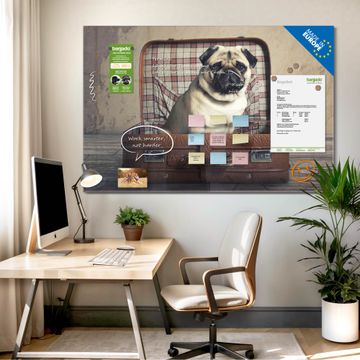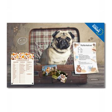 Material: 4mm Sicherheitsglas mit Metallrückwand Eigenschaften: beschreibbar, magnetisch, kratzfest Maße: 75x50x0,6cm, 5,63kg schwer Motiv Nummer 12506 Mops im Koffer Zubehör: inklusive 4 Neodym-Magnete