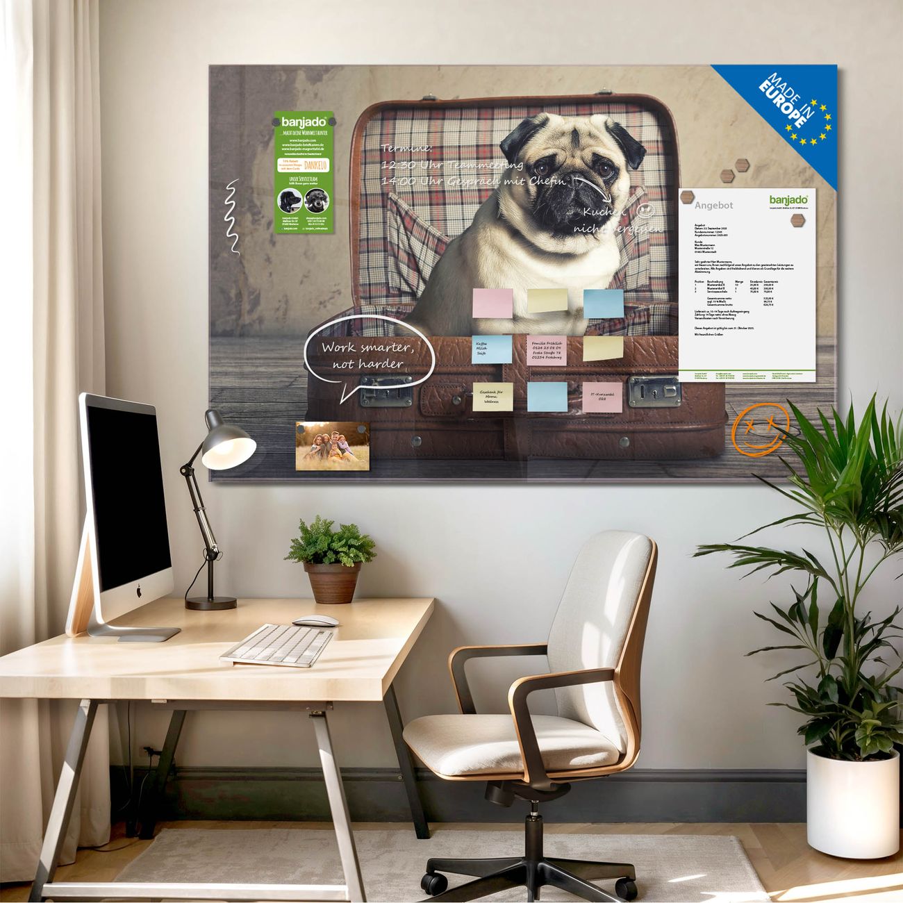 Die banjado Glas Magnettafel mit dem Motiv Motiv Mops im Koffer verbindet Funktionalität mit Stil. Sie ersetzt das Zettelchaos durch klare Strukturen und bringt dabei eine warme, natürliche Atmosphäre in Ihr Zuhause. Ob im Büro, in der Küche oder im Eingangsbereich - dieses Design-Board zieht Blicke an und sorgt für Ordnung mit Charakter.