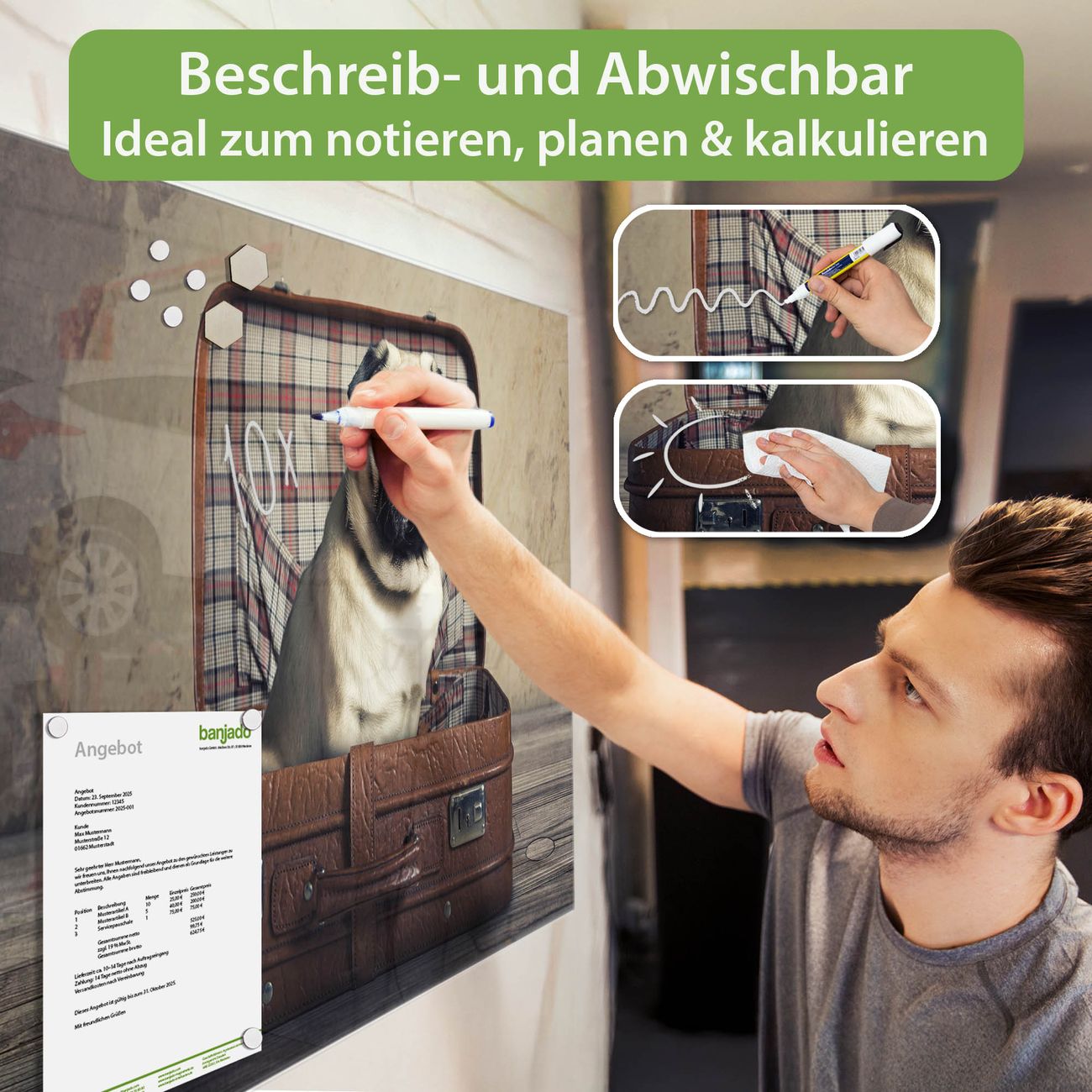 Jede Glas Magnettafel wird in unserer Werkstatt von Hand gefertigt und sorgfältig geprüft. So erhalten Sie ein echtes Qualitätsprodukt, das Funktion und Ästhetik perfekt vereint.?? Warum banjado?
