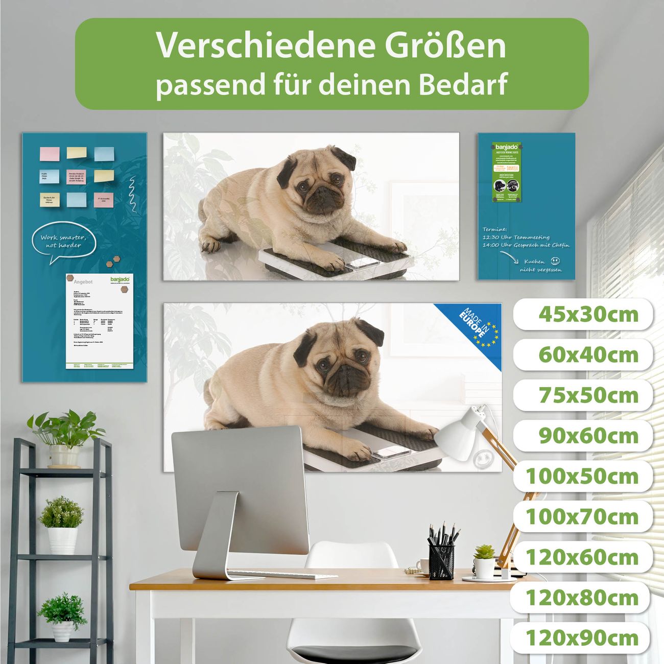 Material: 4mm Sicherheitsglas mit Metallrückwand Eigenschaften: beschreibbar, magnetisch, kratzfest Maße: 100x50x0,6cm, 7,50kg schwer Motiv Nummer 10032 Mops Zubehör: inklusive 4 Neodym-Magnete