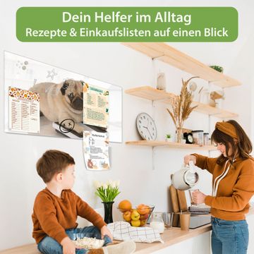 Auf der glatten Glasoberfläche lassen sich Termine, Rezepte oder Notizen ganz einfach mit Kreidestiften festhalten und rückstandslos entfernen. Starke Neodym-Magnete halten Ihre wichtigsten Erinnerungen sicher an Ort und Stelle. So entsteht Ihre ganz persönliche Ideenwand - jeden Tag neu.