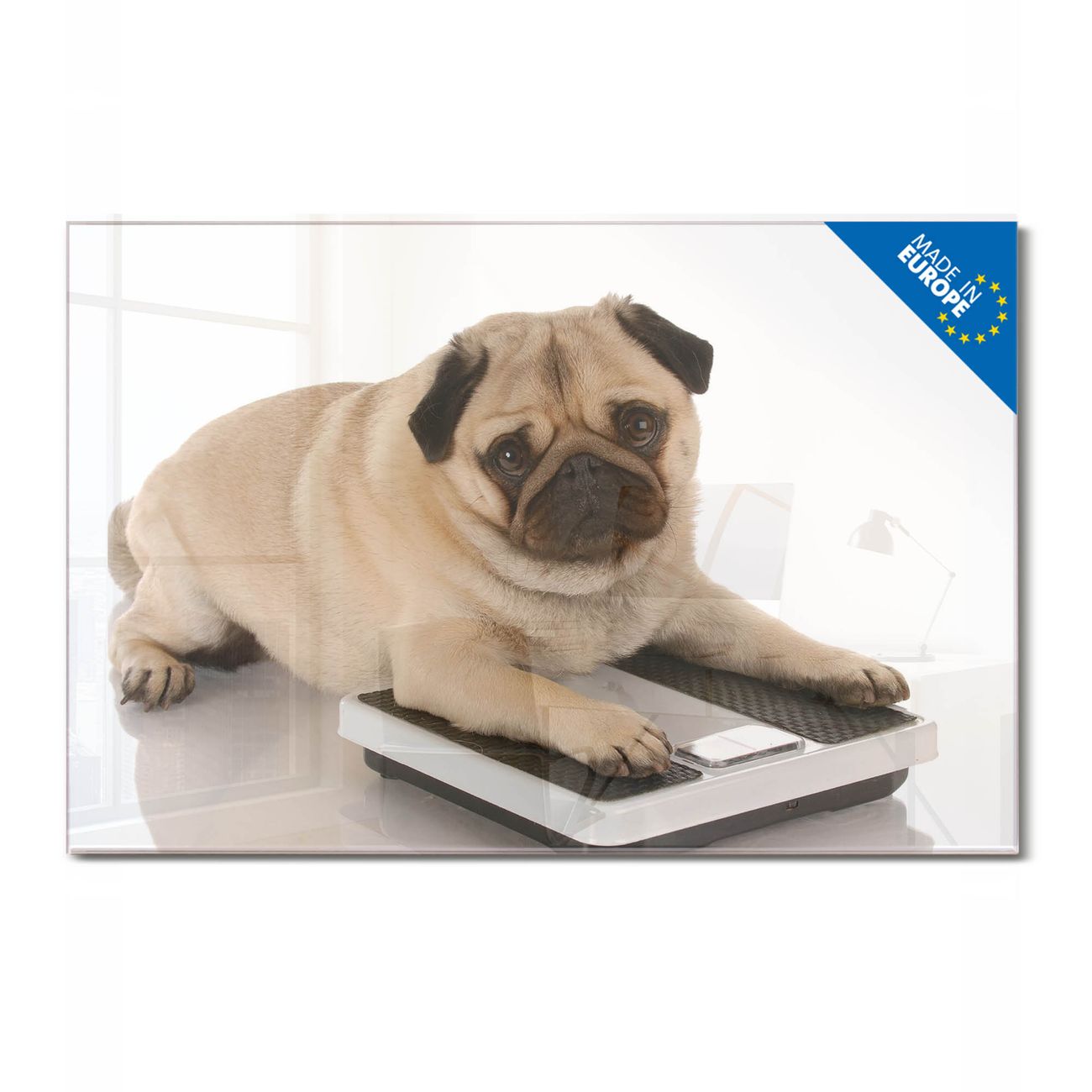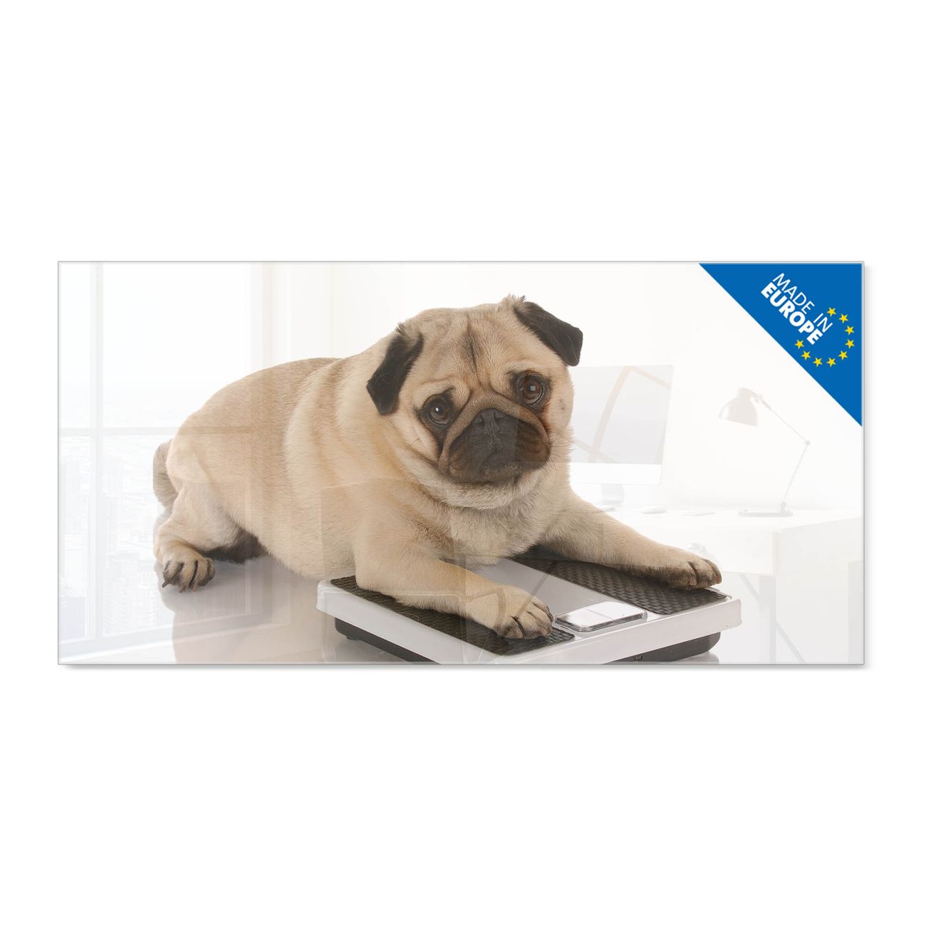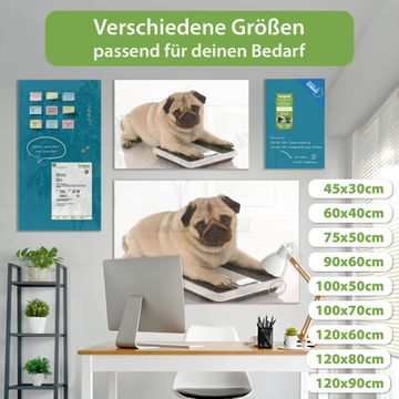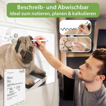 Material: 4mm Sicherheitsglas mit Metallrückwand Eigenschaften: beschreibbar, magnetisch, kratzfest Maße: 120x60x0,6cm, 10,80kg schwer Motiv Nummer 10032 Mops Zubehör: inklusive 4 Neodym-Magnete