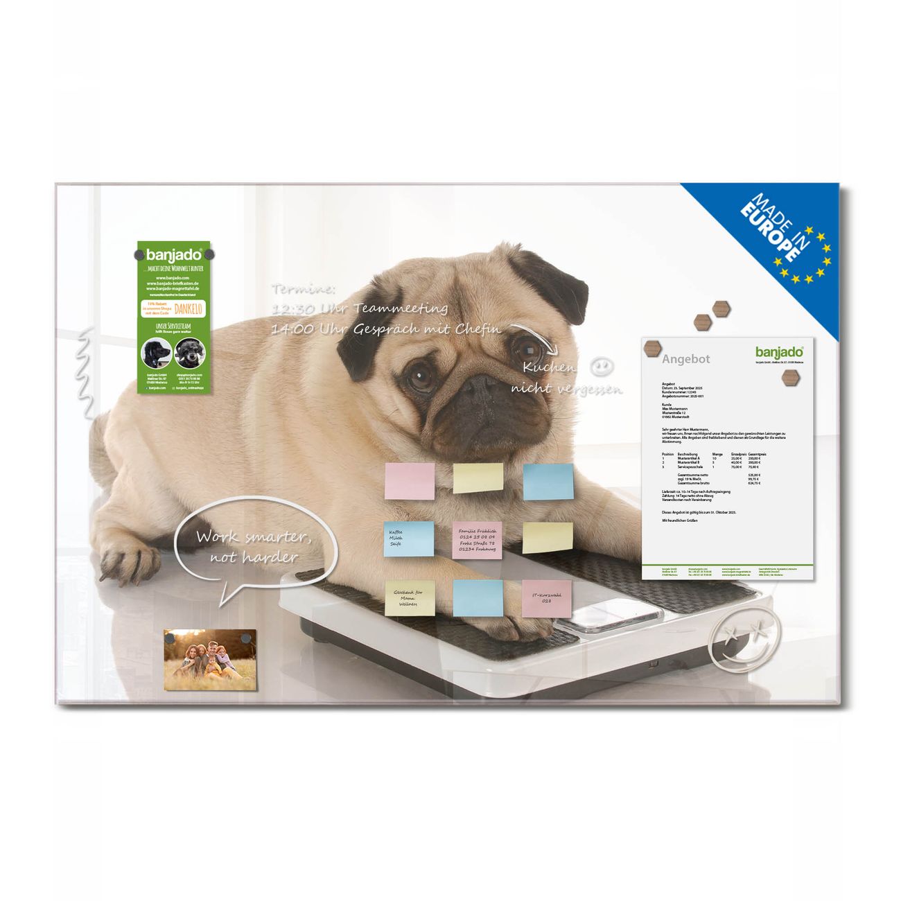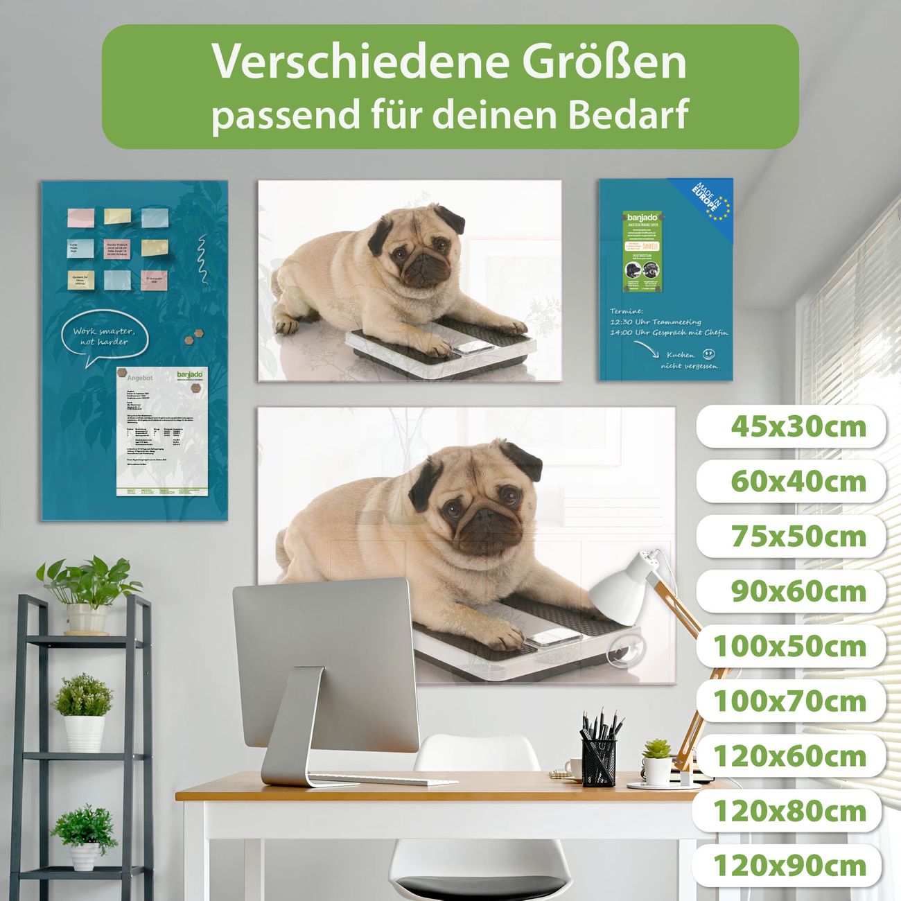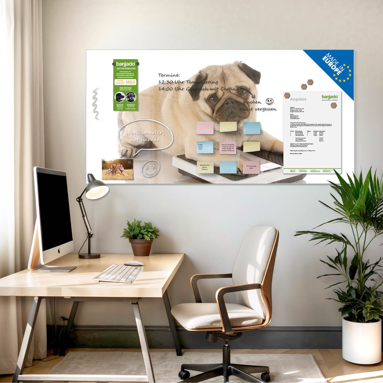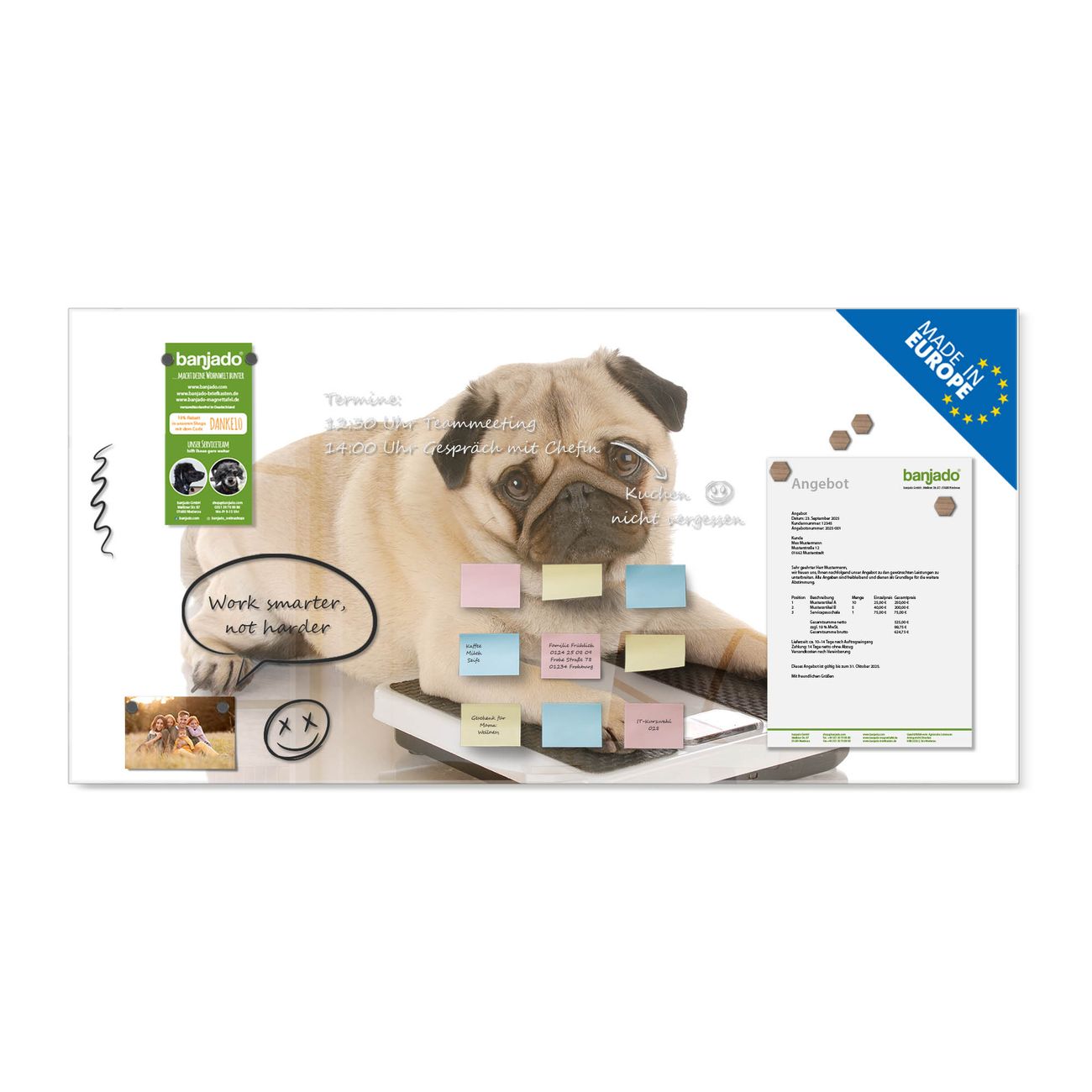 Jede Glas Magnettafel wird in unserer Werkstatt von Hand gefertigt und sorgfältig geprüft. So erhalten Sie ein echtes Qualitätsprodukt, das Funktion und Ästhetik perfekt vereint.?? Warum banjado?