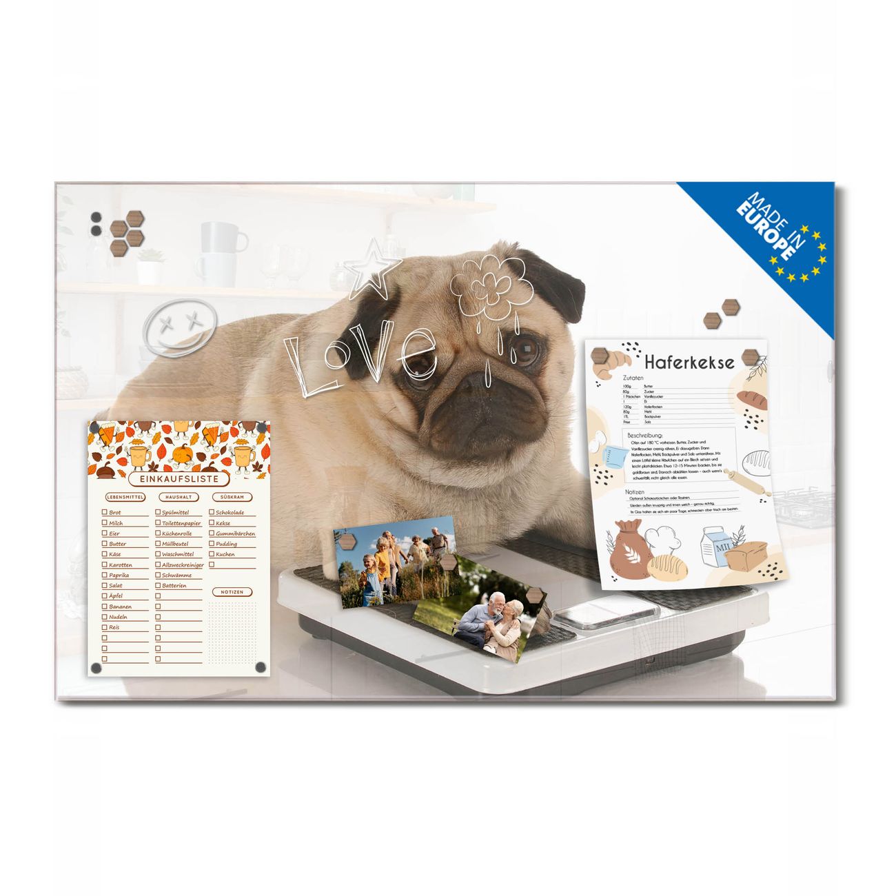 Ein Stück Design, das Ihren Alltag organisiert. Schreiben, heften, inspirieren - alles an einem Ort. Qualität, die man spürt. Montage leicht gemacht. Handwerk mit Herz - veredelt in Sachsen. Einzigartiges Design mit Motiv Motiv Mops Beschreibbare Glasoberfläche, leicht zu reinigen Starke Magnetkraft durch Stahlrückwand Inklusive 4 Neodym-Magneten Flexible Montageoptionen Handveredelt in Sachsen - Qualität, die bleibt