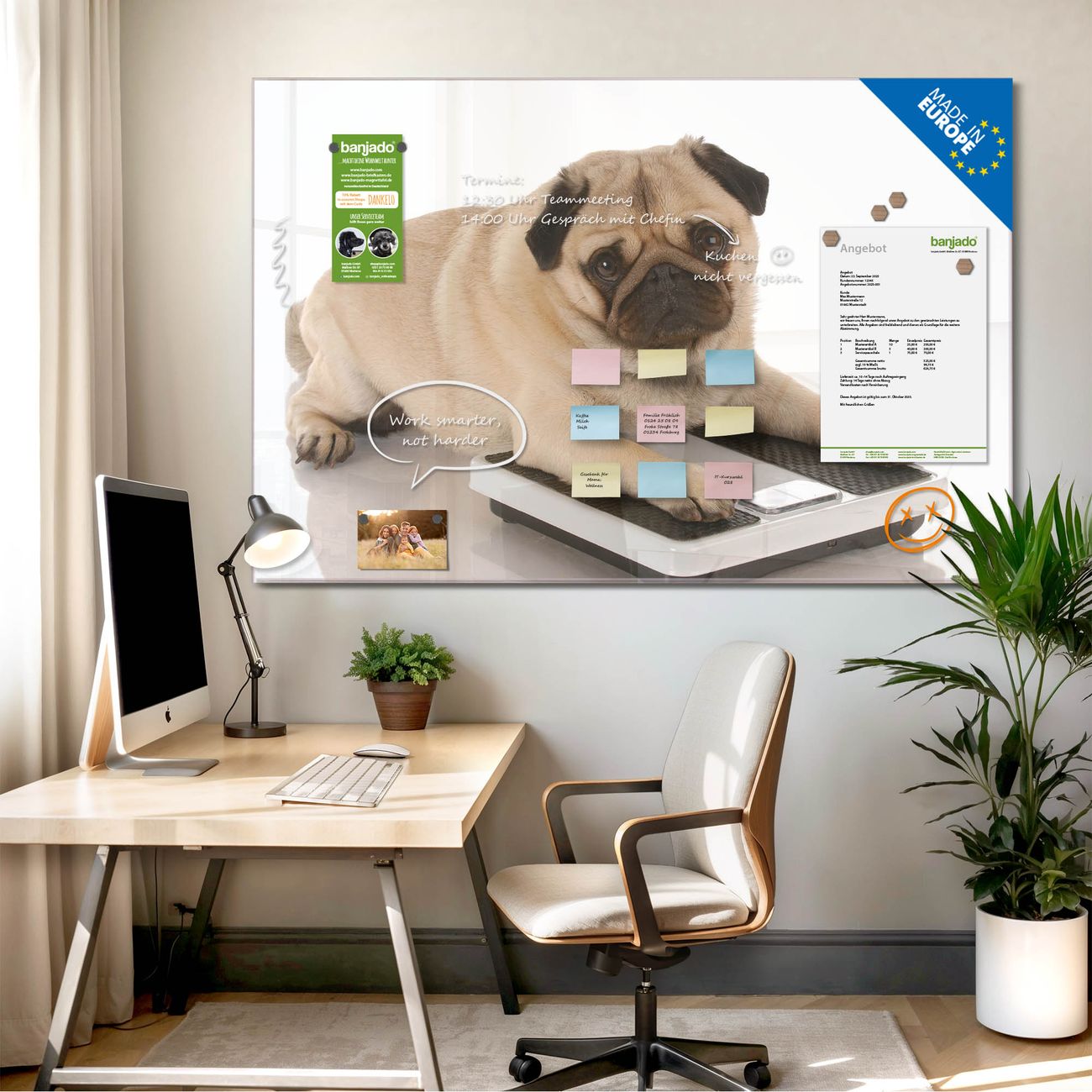 Material: 4mm Sicherheitsglas mit Metallrückwand Eigenschaften: beschreibbar, magnetisch, kratzfest Maße: 120x80x0,6cm, 14,40kg schwer Motiv Nummer 10032 Mops Zubehör: inklusive 4 Neodym-Magnete