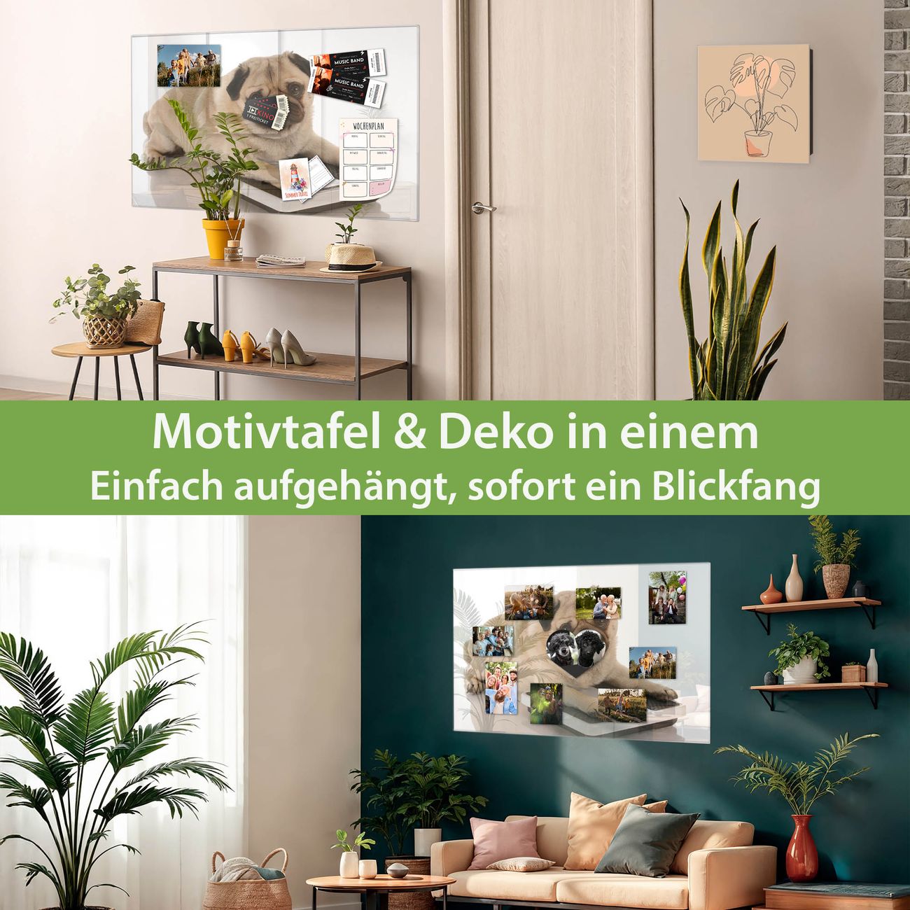 Die banjado Glas Magnettafel mit dem Motiv Motiv Mops verbindet Funktionalität mit Stil. Sie ersetzt das Zettelchaos durch klare Strukturen und bringt dabei eine warme, natürliche Atmosphäre in Ihr Zuhause. Ob im Büro, in der Küche oder im Eingangsbereich - dieses Design-Board zieht Blicke an und sorgt für Ordnung mit Charakter.